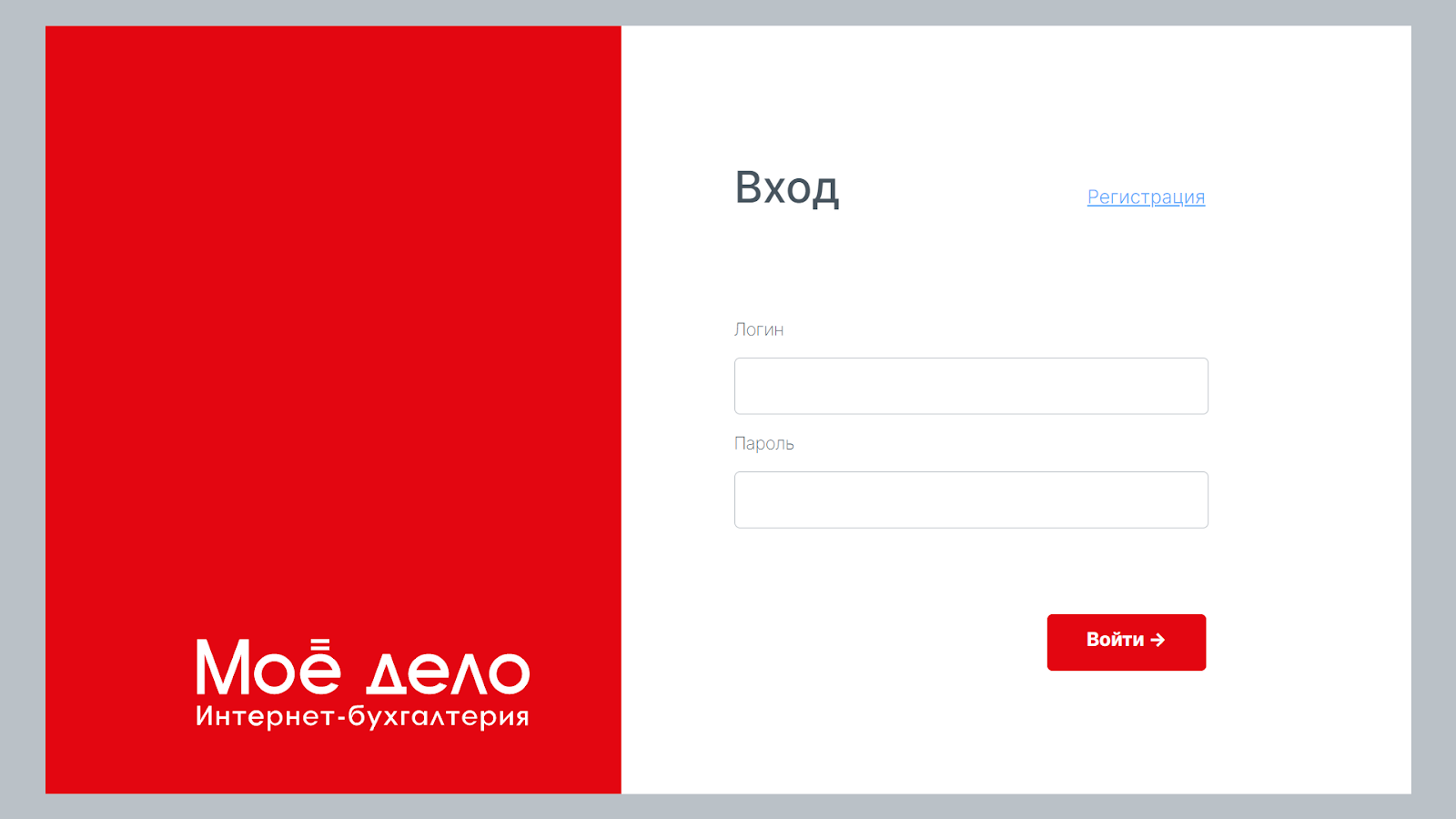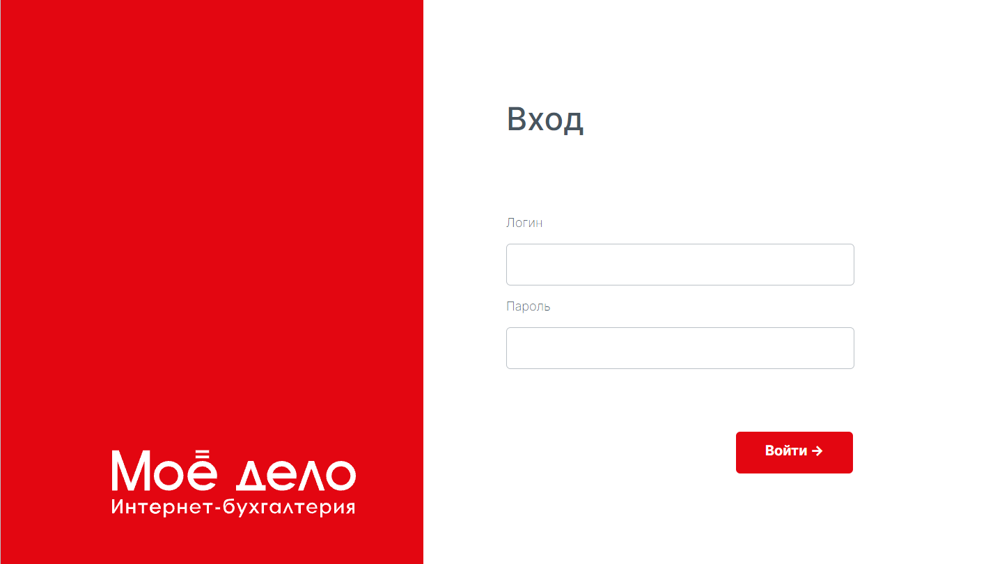 При успешной регистрации откроется стартовая страница для входа. Введите логин и пароль от личного кабинета «Моё дело» и нажмите кнопку «Войти»: