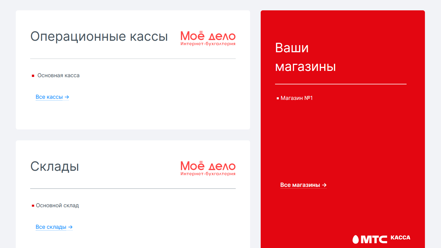 - загрузка в сервис «МТС Касса» данных о товаре, складах и кассах из системы «Моё дело»;
