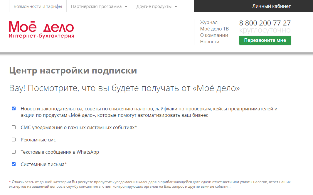 В разделе «Уведомления» можно настроить рассылку напоминаний о событиях Календаря и рассылку новостной ленты сервиса. А именно то, как сервис «Моё дело» будет присылать вам напоминания о предстоящих событиях (сдача отчёта, уплата налогов).