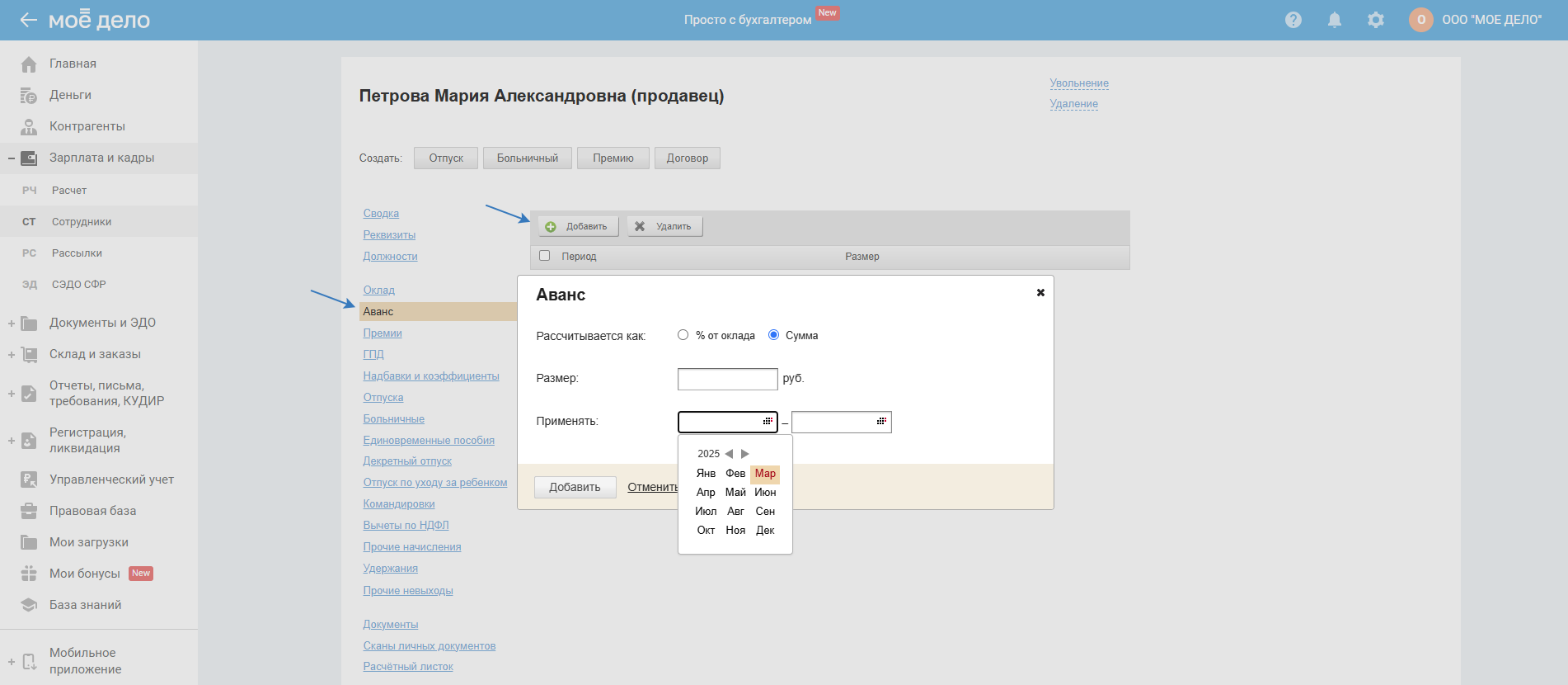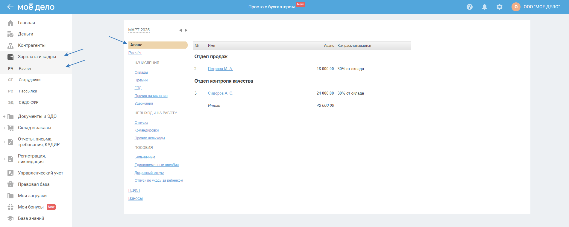 Данные раздела «Расчёт — Аванс» формируются из информации по авансу, установленной в настройках работника и настроек зарплаты: