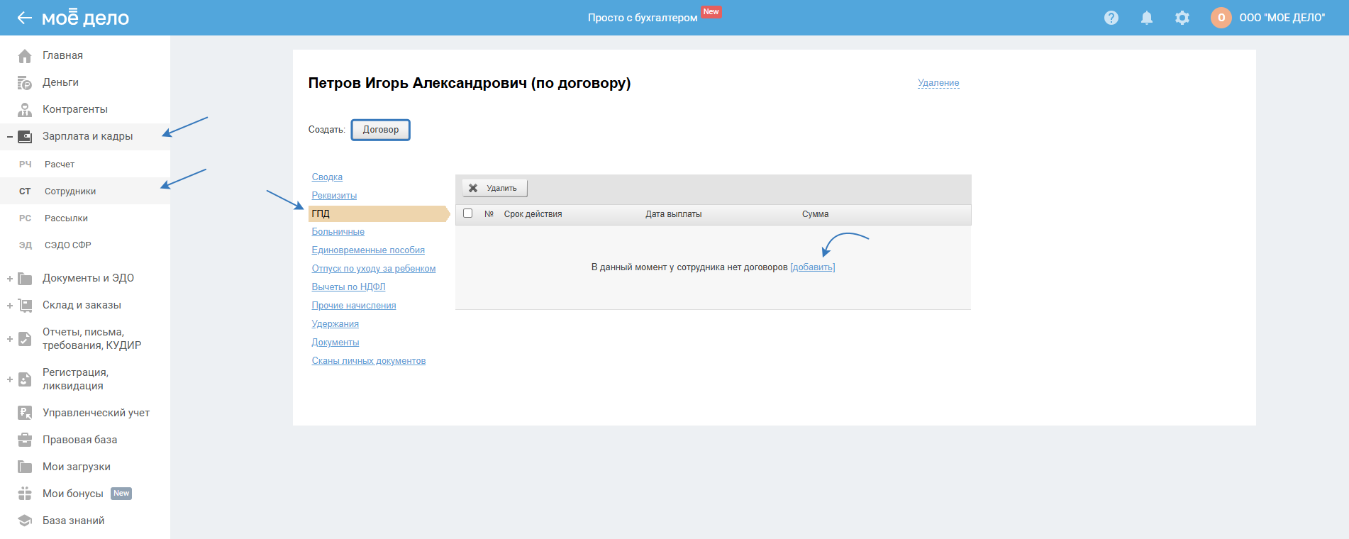 1. Данная дата определяется сервисом из информации, указанной вами при добавлении договора. Если вы выбрали вариант расчёта по ГПД на определённую дату, то там будет указана именно она. Если дату вы не указывали и выбрали вариант «с расчётом», то дата будет определяться, как установленное вами число месяца, следующего за расчётным, для выплаты зарплаты.