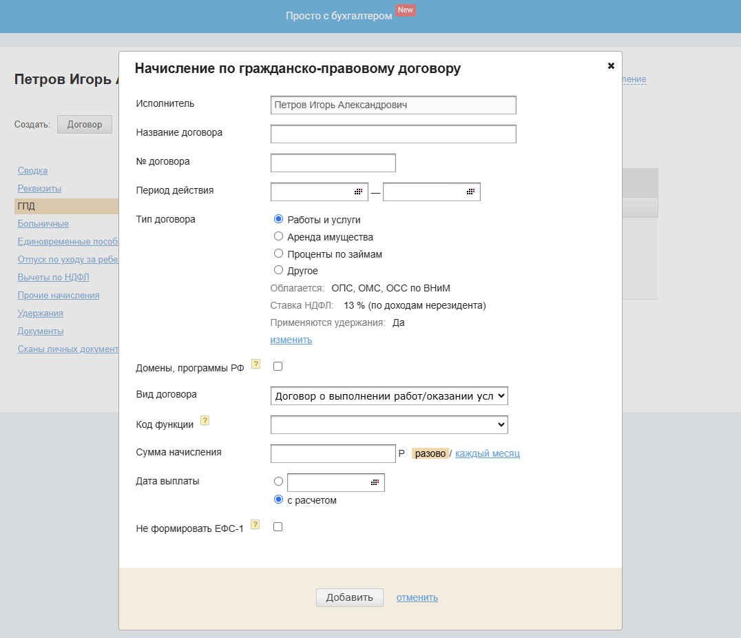 Для добавления данных по начислениям по договору такого типа необходимо или нажать на кнопку «Договор» или на активную ссылку «добавить»: