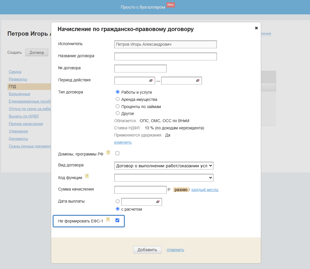 Включите данную настройку, если вносите акт выполненных работ по ГПД. Сведения о заключении/расторжении ГПД в отчёт ЕФС-1: Сведения о трудовой деятельности попадать не будут.