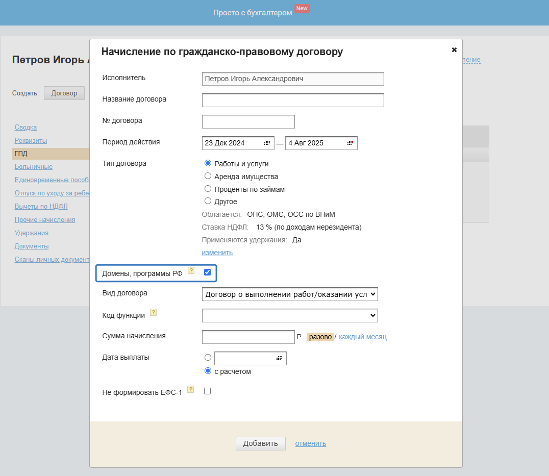 В этом разделе данные по начислениям по гражданско-правовым договорам (ГПД), если таковые были в расчётном месяце.