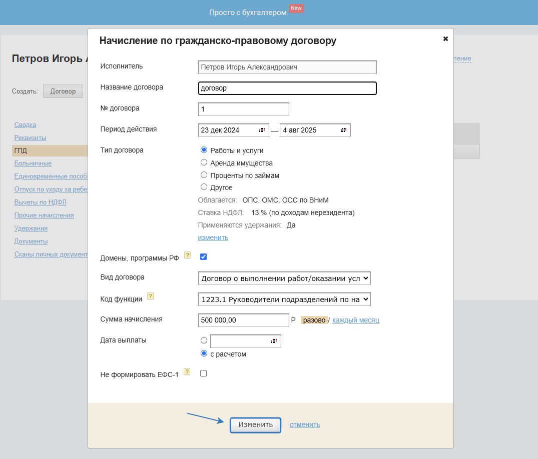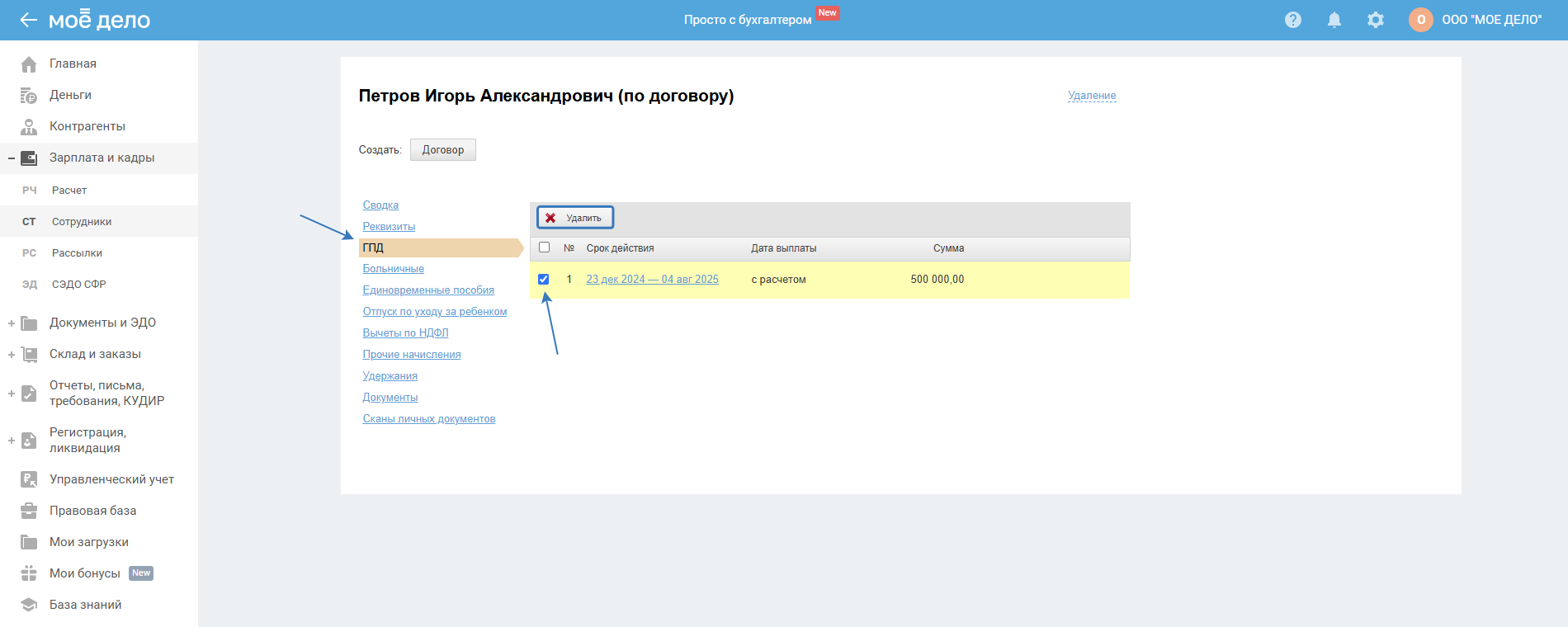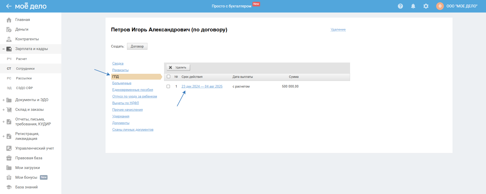 Внести изменения в данные уже созданного ГПД или в сумму начисления по нему можно, нажав на активную ссылку в графе «Срок действия»: