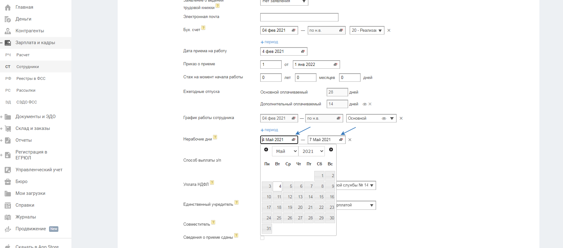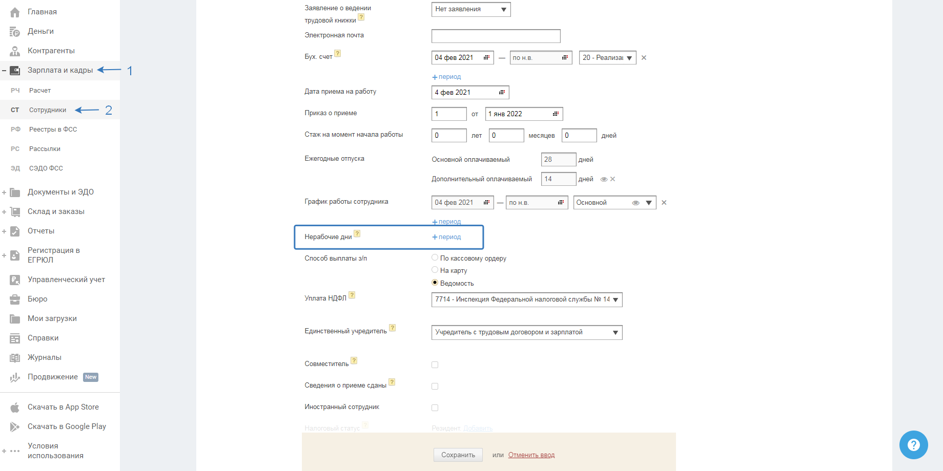 Если у вас введены нерабочие дни, т.е. сотрудник не привлекался к работе в данный период, то в карточке сотрудника добавьте период нерабочих дней напротив поля «Нерабочие дни».