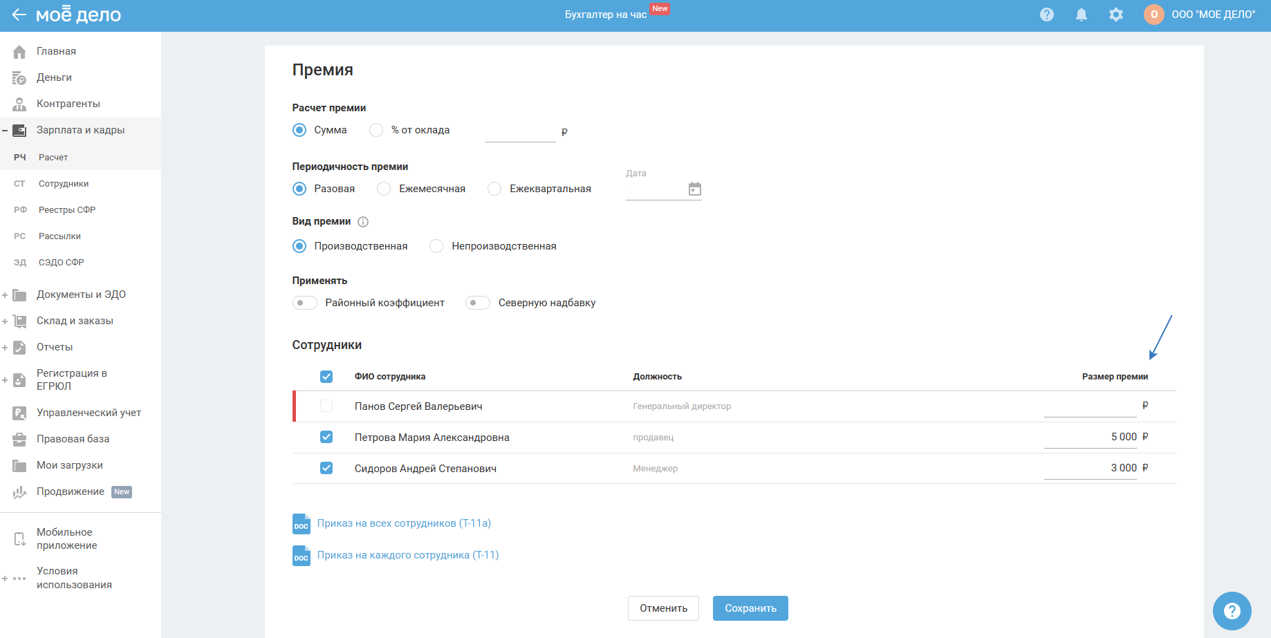 Премию в разделе «Зарплата и кадры — Расчёт — Премии» удобно использовать, если нужно создать премии нескольким сотрудникам одновременно.