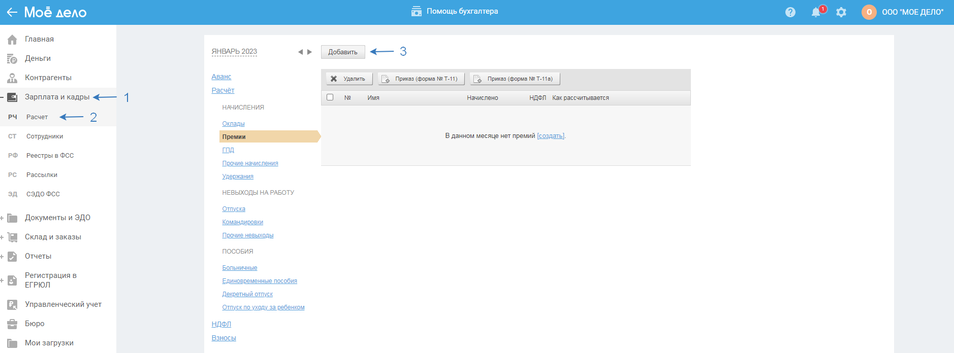 Перейдите в раздел «Зарплата и кадры — Сотрудники», нажмите на фамилию сотрудника и в открывшемся окне в меню слева выберите пункт «Премии», после чего нажмите на кнопку «Добавить» или ссылку «Добавить» (доступна, если нет созданных премий):