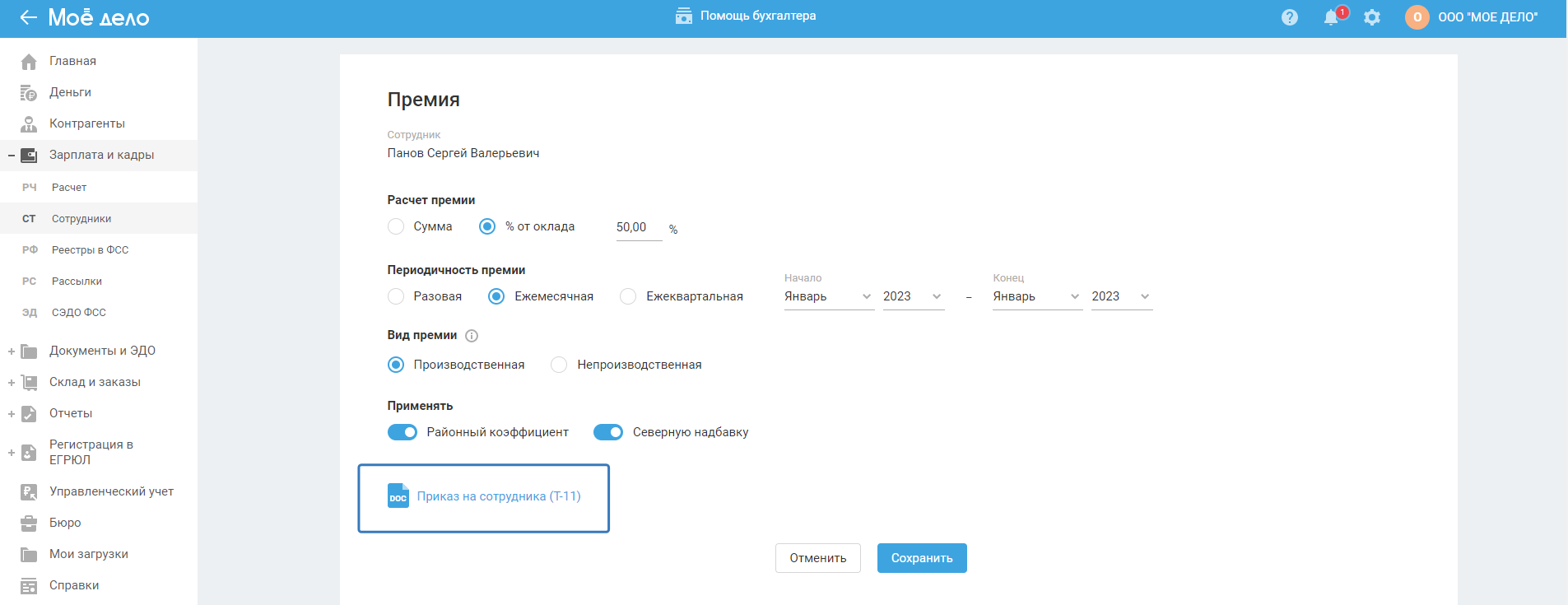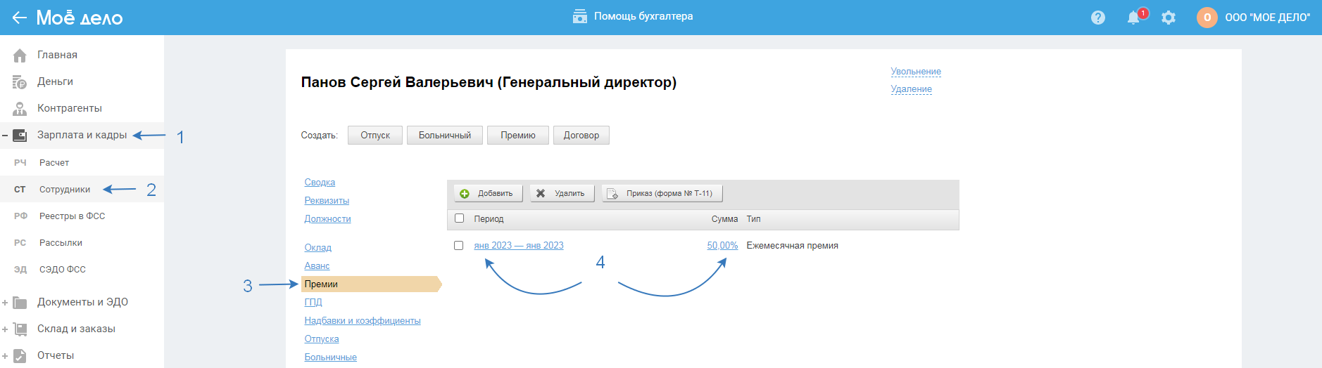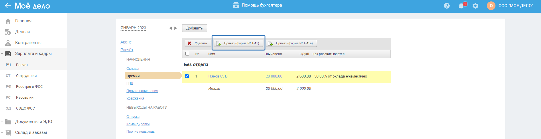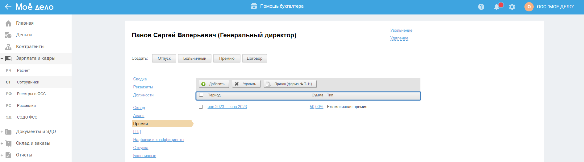 Перейдите в раздел «Зарплата и кадры — Сотрудники», нажмите на фамилию сотрудника и в открывшемся окне в меню слева выберите пункт «Премии», после чего нажмите на кнопку «Приказ (форма № Т-11)», расположенную в шапке таблицы: