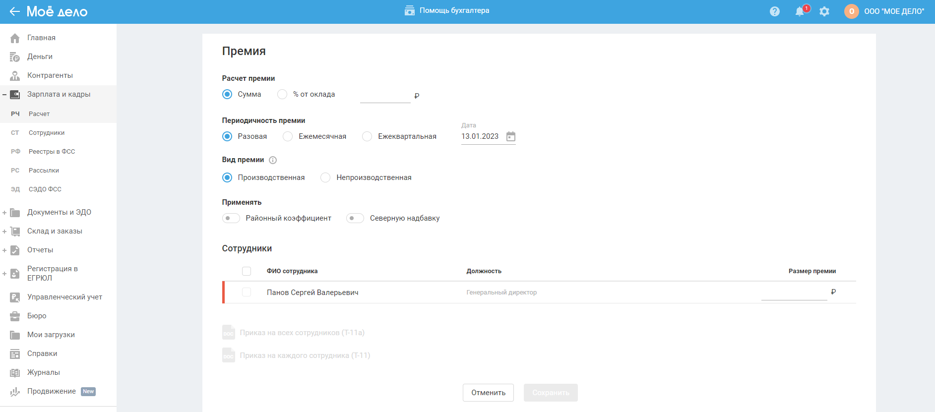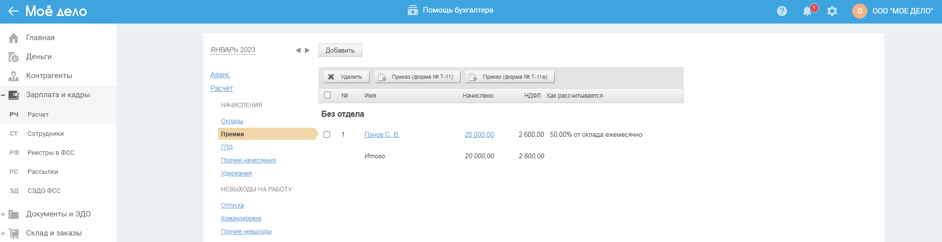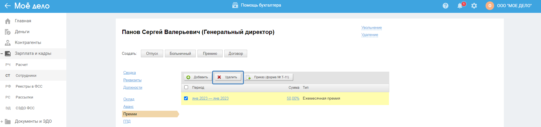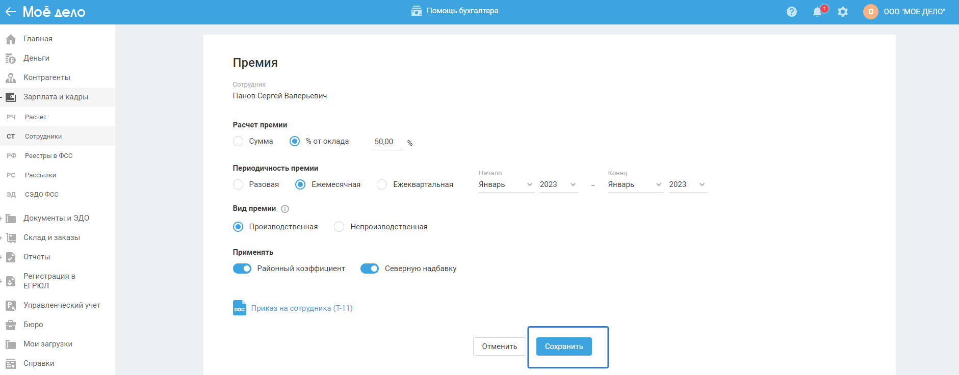 Перейдите в раздел «Зарплата и кадры — Сотрудники», нажмите на фамилию сотрудника и в открывшемся окне в меню слева выберите пункт «Премии», после чего нажмите на кнопку «Приказ (форма № Т-11)», расположенную в шапке таблицы: