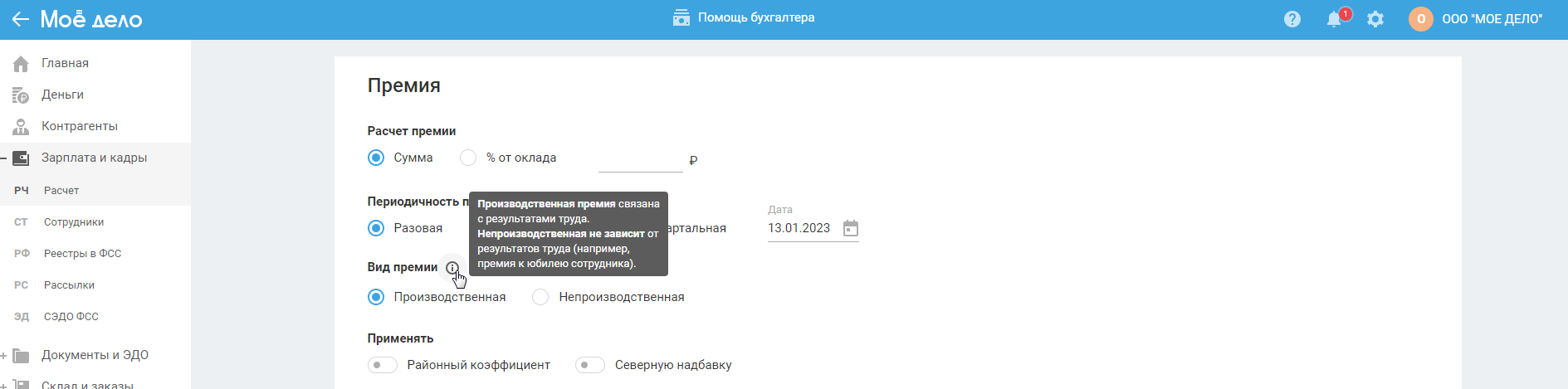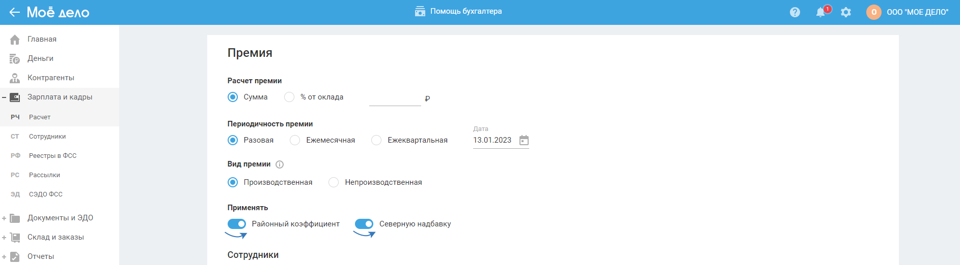 Расчёт премии — выберите способ расчёта премии: фиксированная сумма или процент от оклада, далее заполните значение в рублях или процентах соответственно: