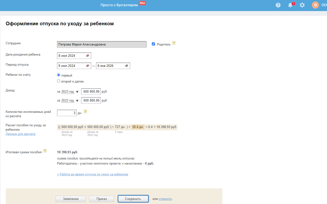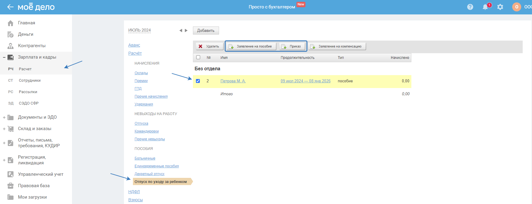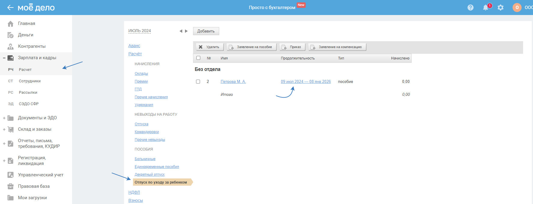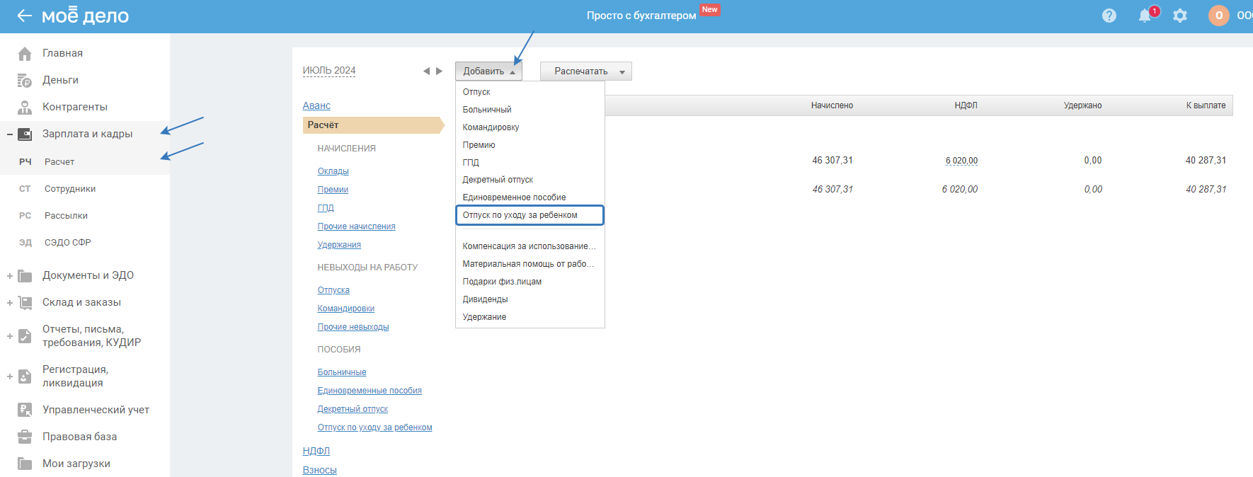 Создать начисление «Отпуску по уходу за ребёнком» в сервисе можно несколькими способами: