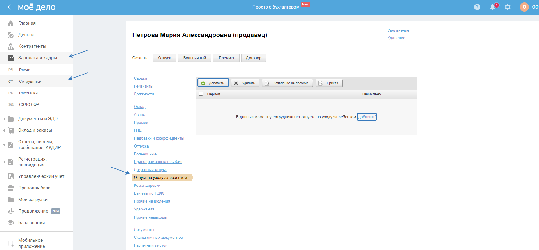 1. Перейдите в раздел «Зарплата и кадры — Сотрудники», в левом меню выберите пункт «Отпуск по уходу за ребёнком» и нажмите на кнопку «Добавить»: