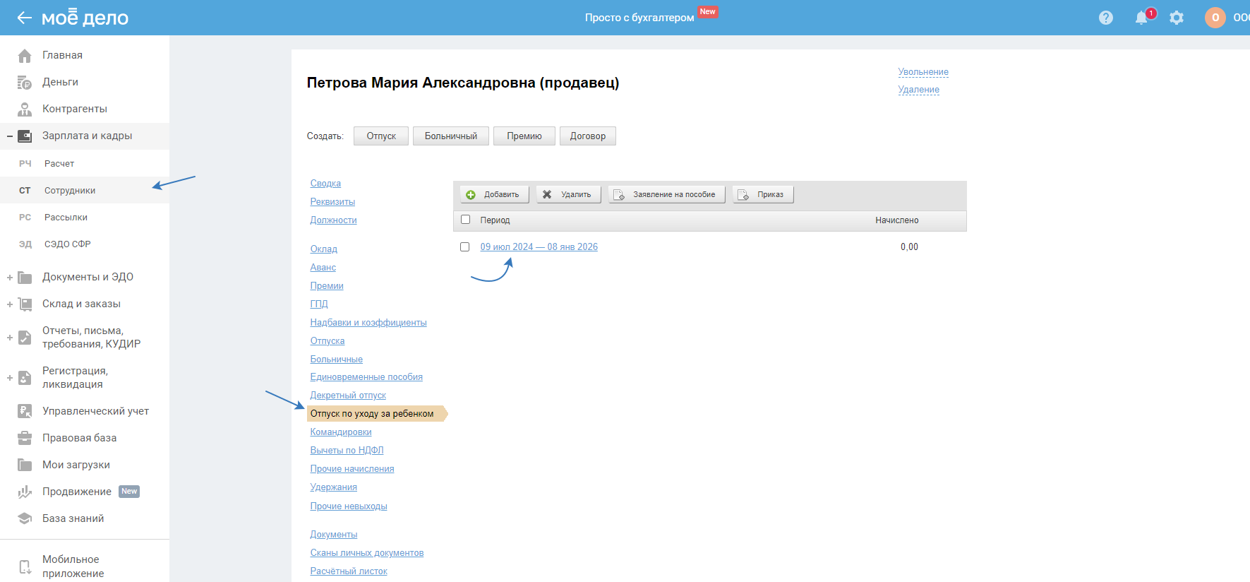 Либо в разделе «Сотрудники» перейдите в личные данные сотрудника, выберите «Отпуск по уходу за ребёнком» и нажмите на период: