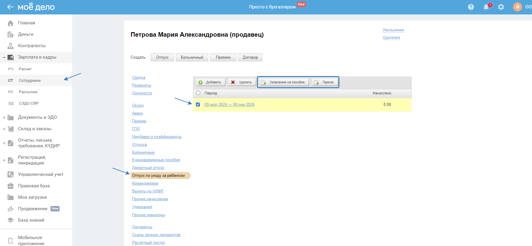• «Сотрудники». В карточке сотрудника перейдите в «Отпуск по уходу за ребёнком», выберите добавленный отпуск и нажмите на кнопку необходимого вам документа: