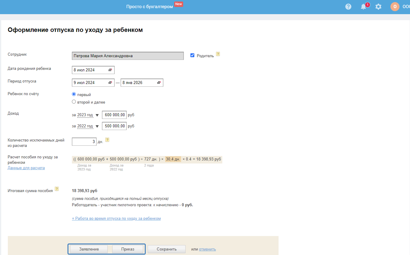 В открывшейся форме оформления отпуска по уходу за ребёнком необходимо заполнить данные: