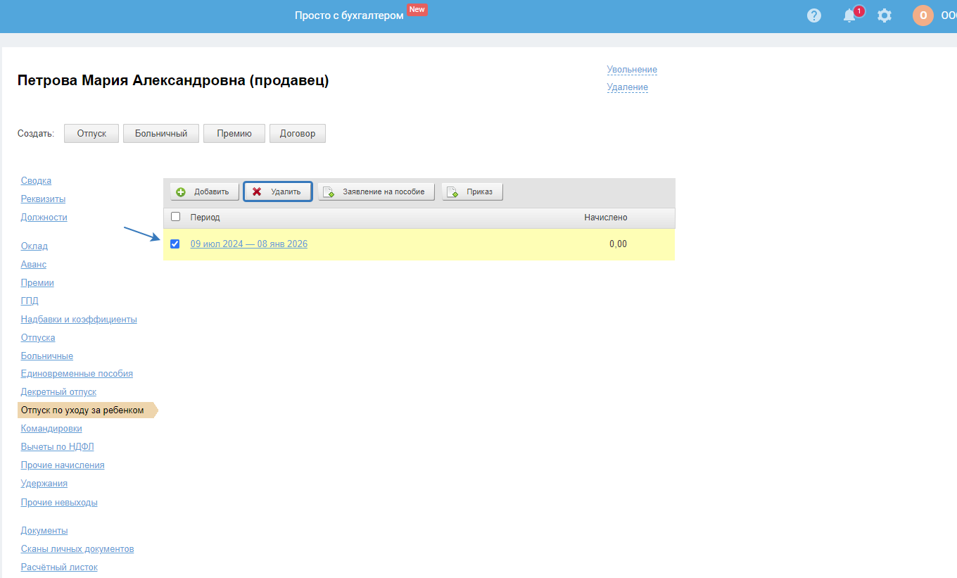 Чтобы удалить ошибочно созданный отпуск по уходу за ребёнком, выберите его в разделе «Расчёт»/«Сотрудники» и нажмите на кнопку «Удалить»: