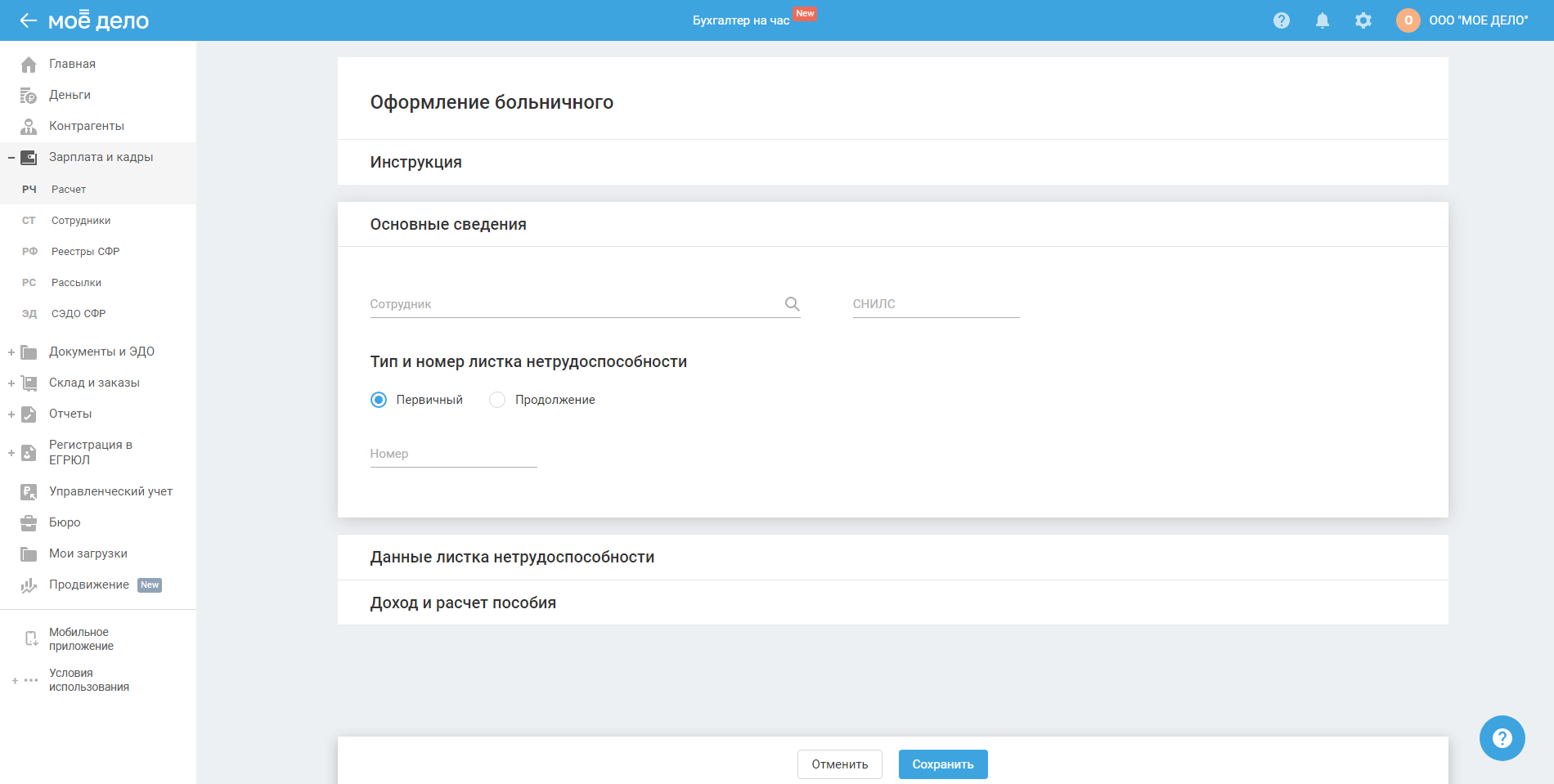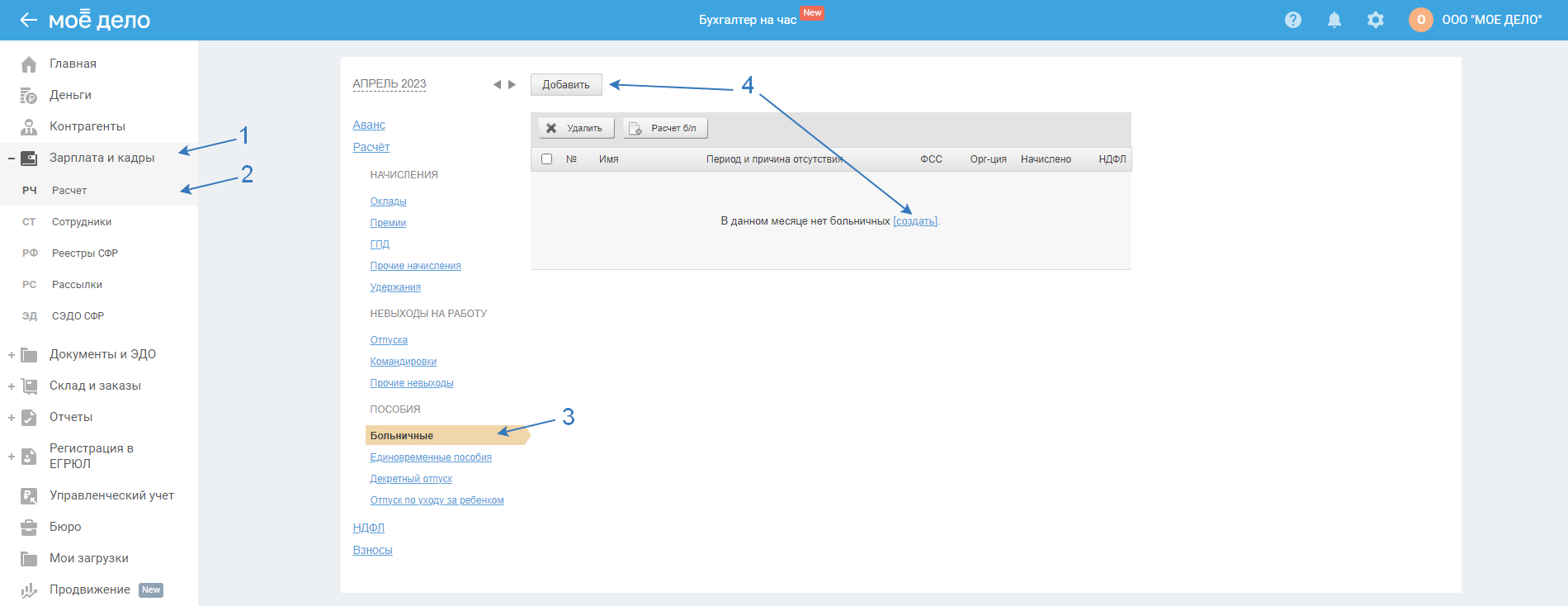 В сервисе «Моё дело» пройдите в раздел «Зарплата и кадры — Расчёт», выберите в вертикальном меню «Больничный», нажмите «Добавить / создать»: