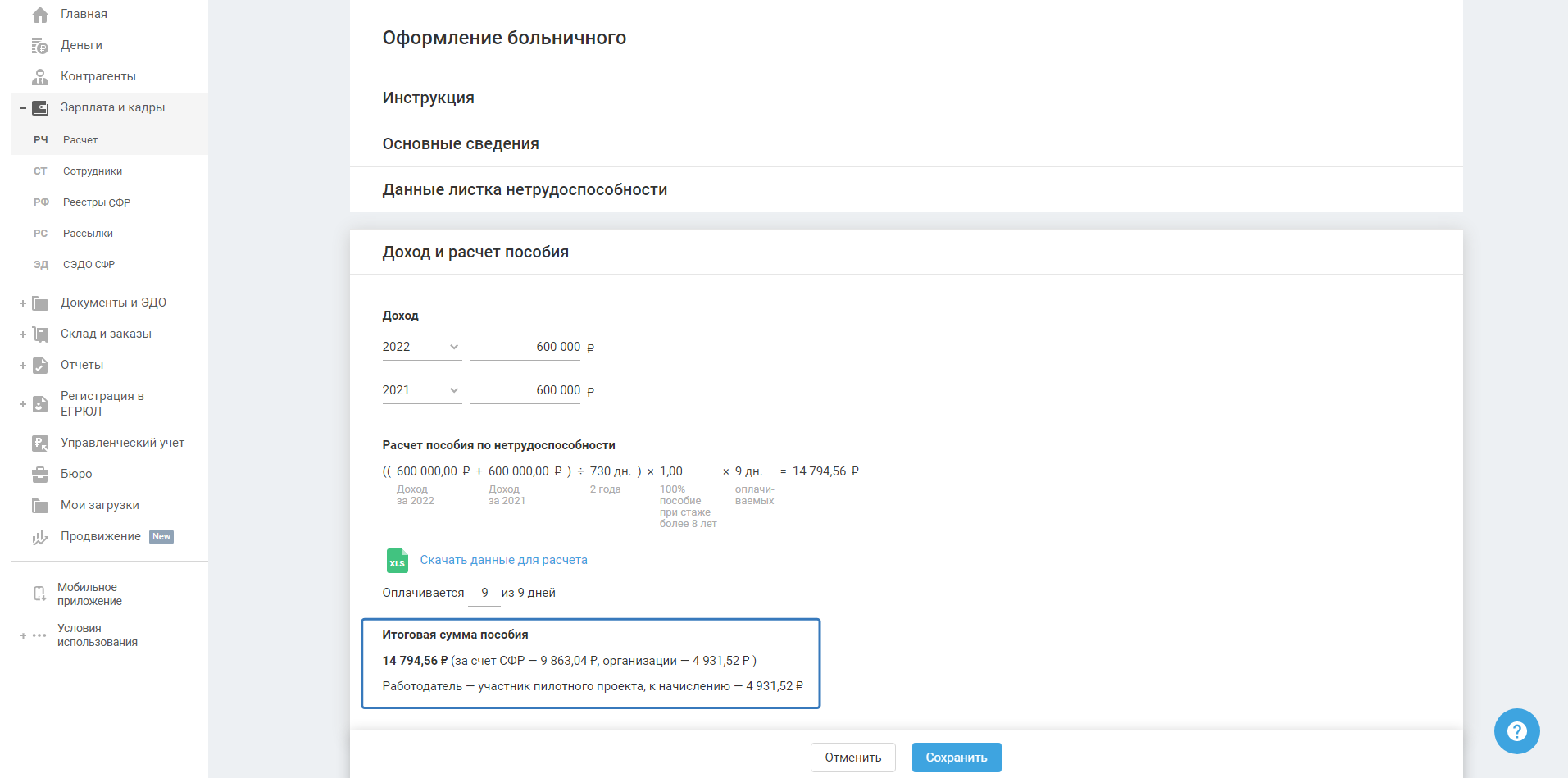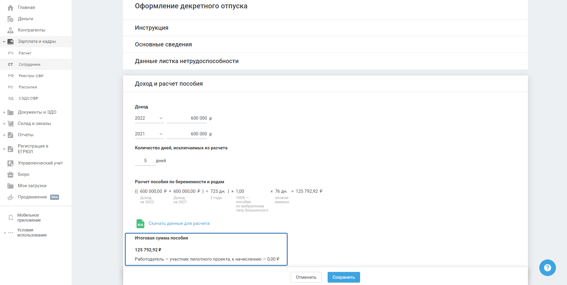 4) Данные для расчёта из карточки пособия. Данные о доходах и расчётном периоде подтягиваются из ранее заполненной карточки пособия.