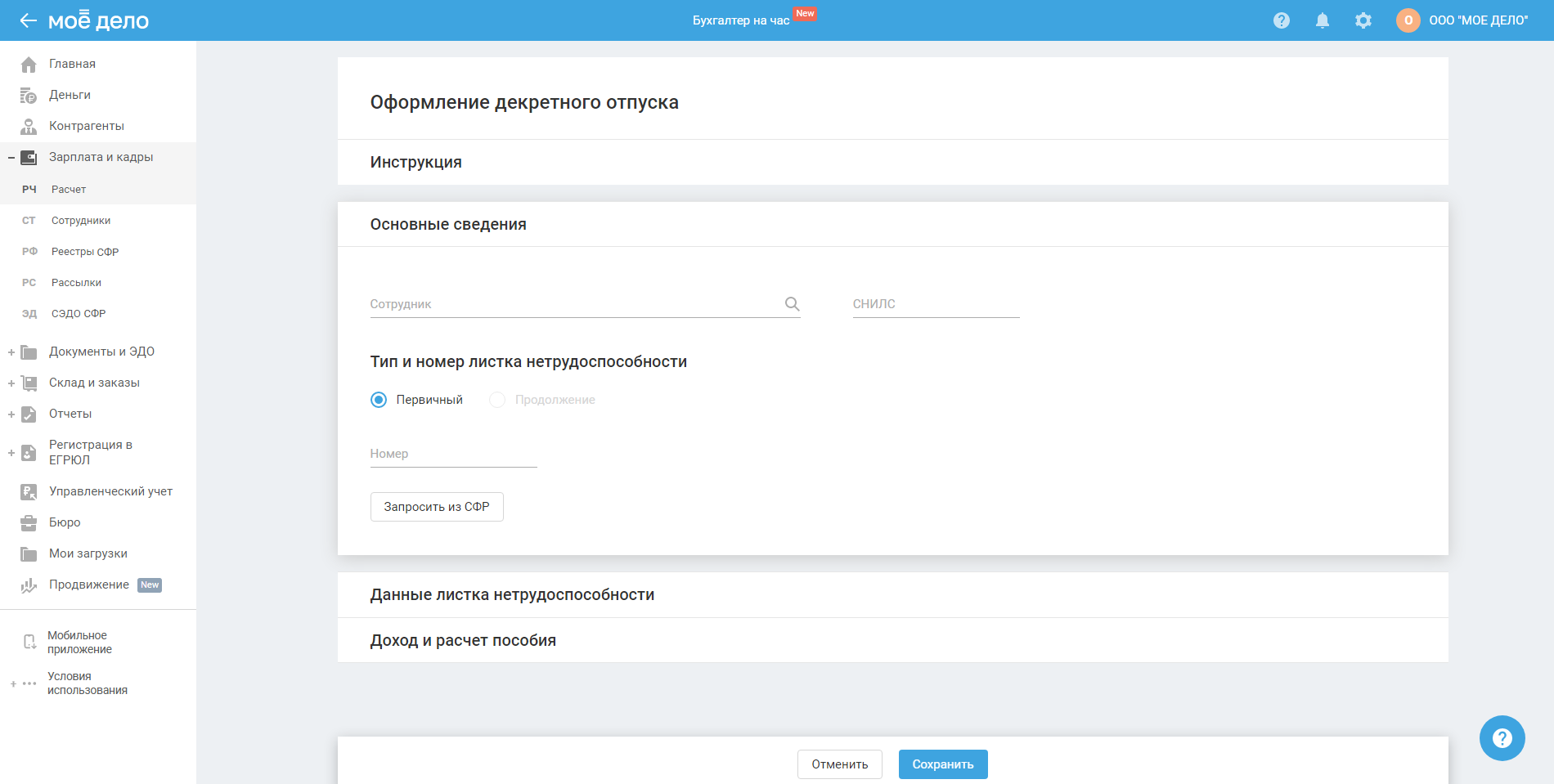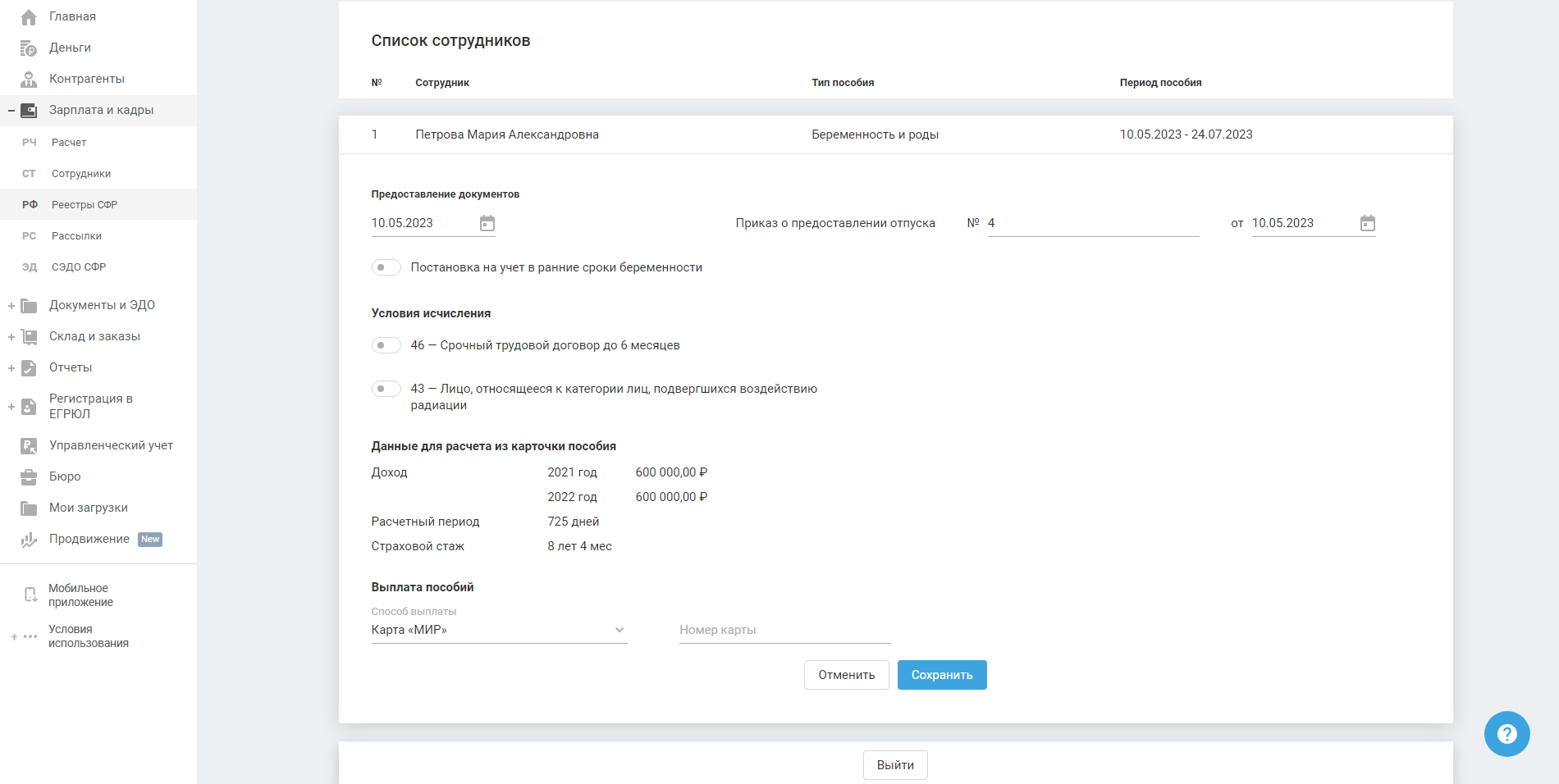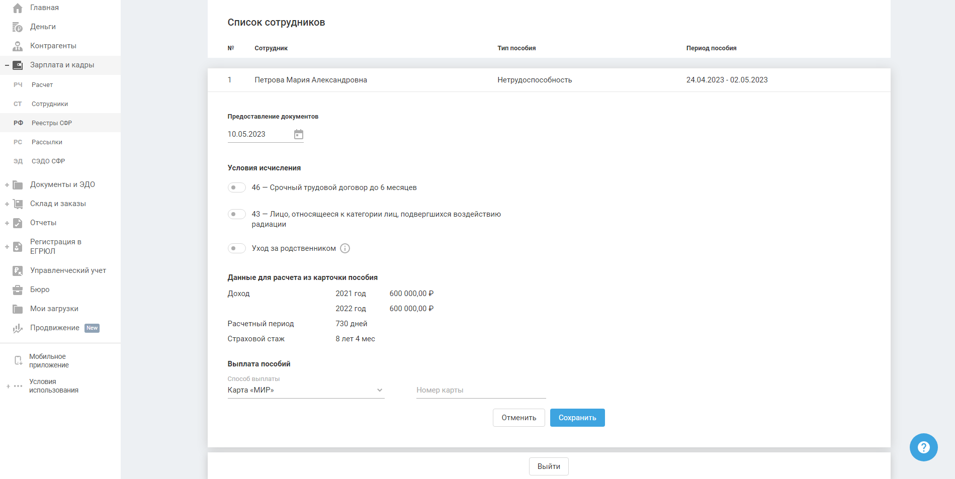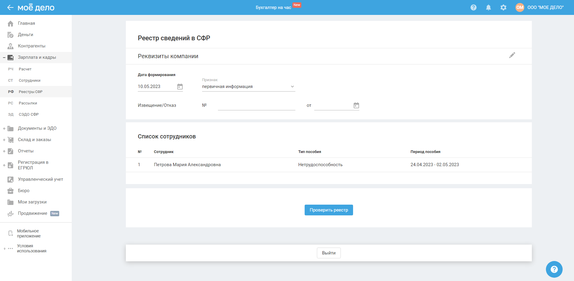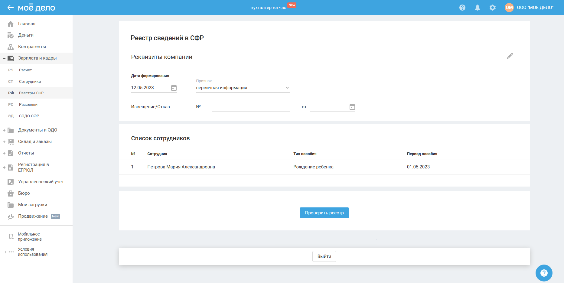 Раздел доступен для ИП и ООО в пилотном проекте СФР.