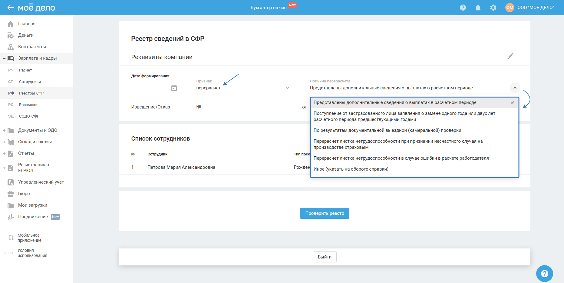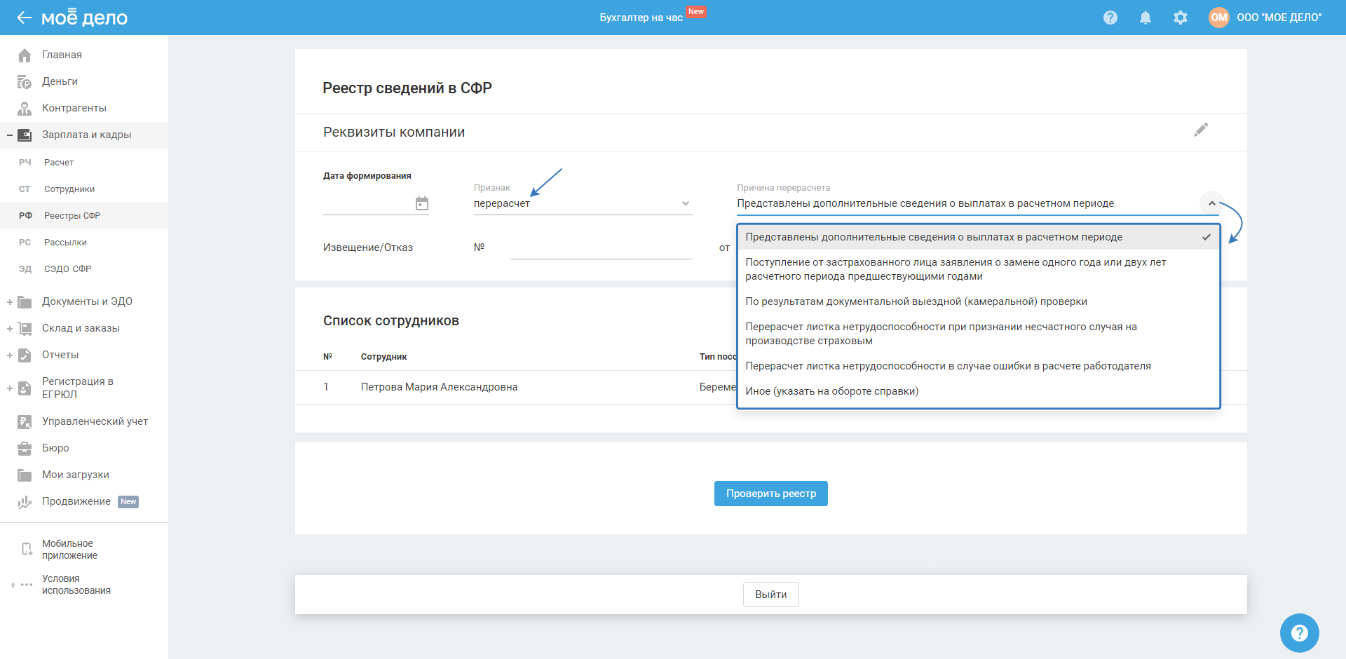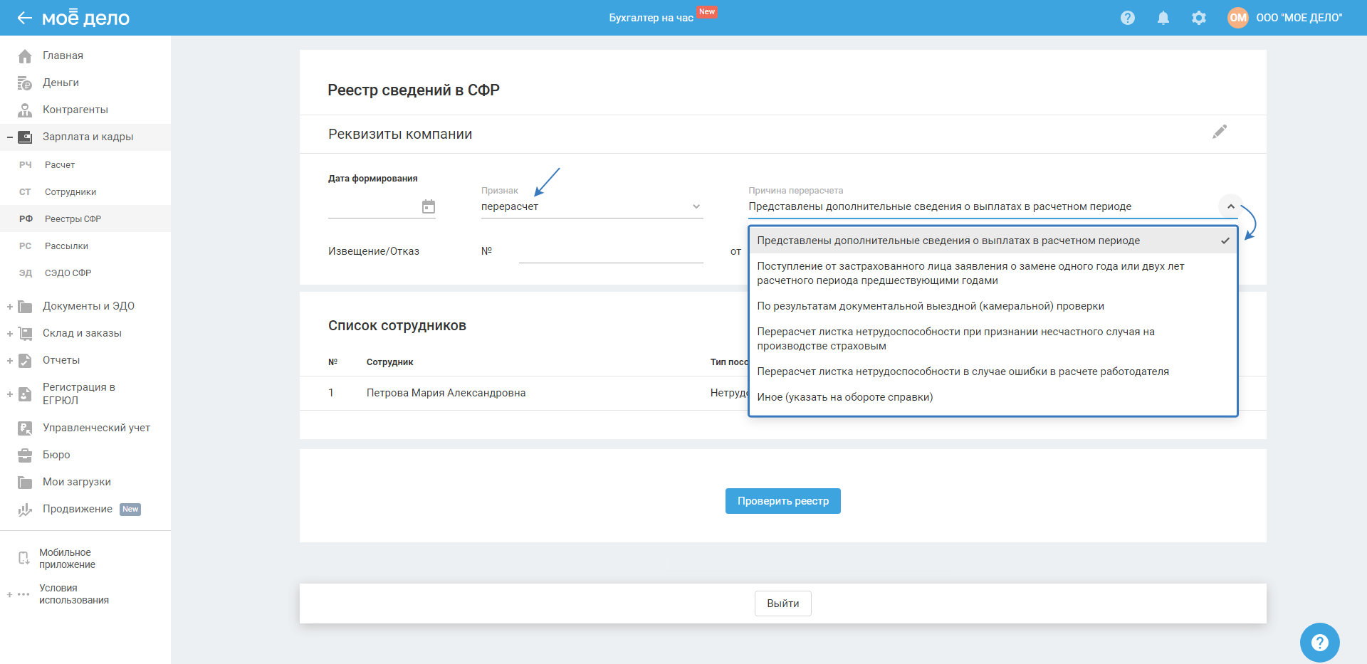 • перерасчёт — если реестр ранее был отклонен и направляется повторно с новой исправленной информацией, то вам нужно выбрать причину: