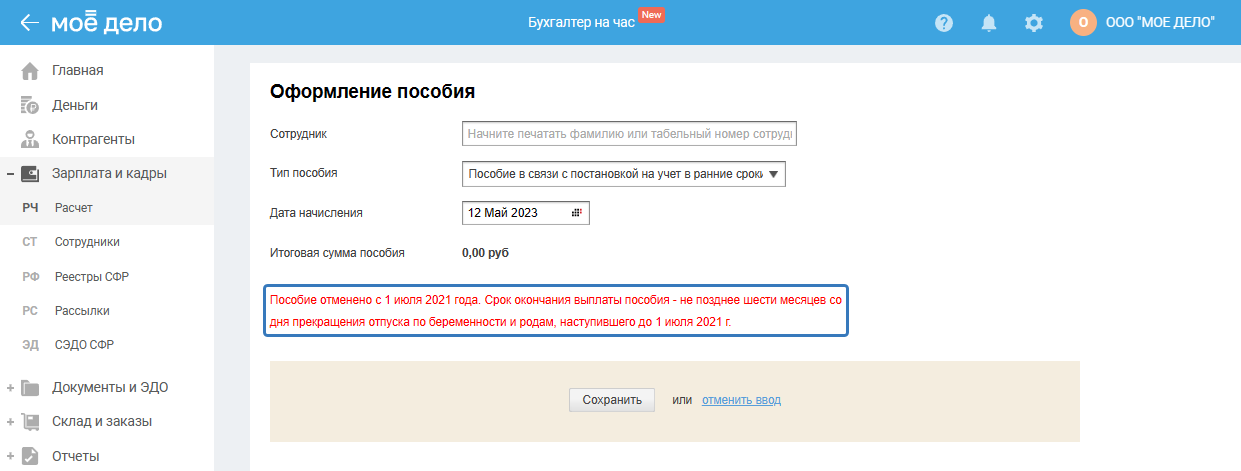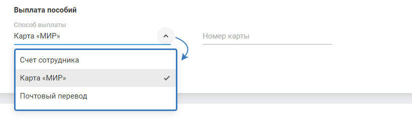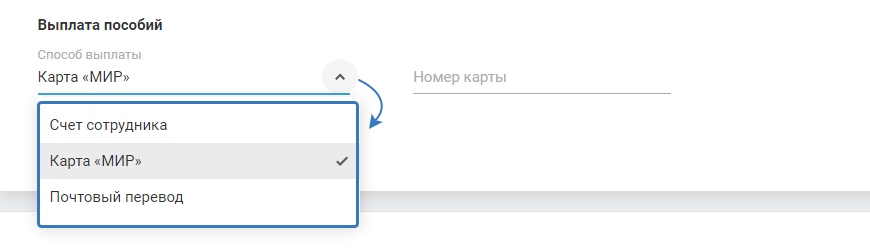 6) Выплата пособий. Выберите способ выплаты из выпадающего списка: