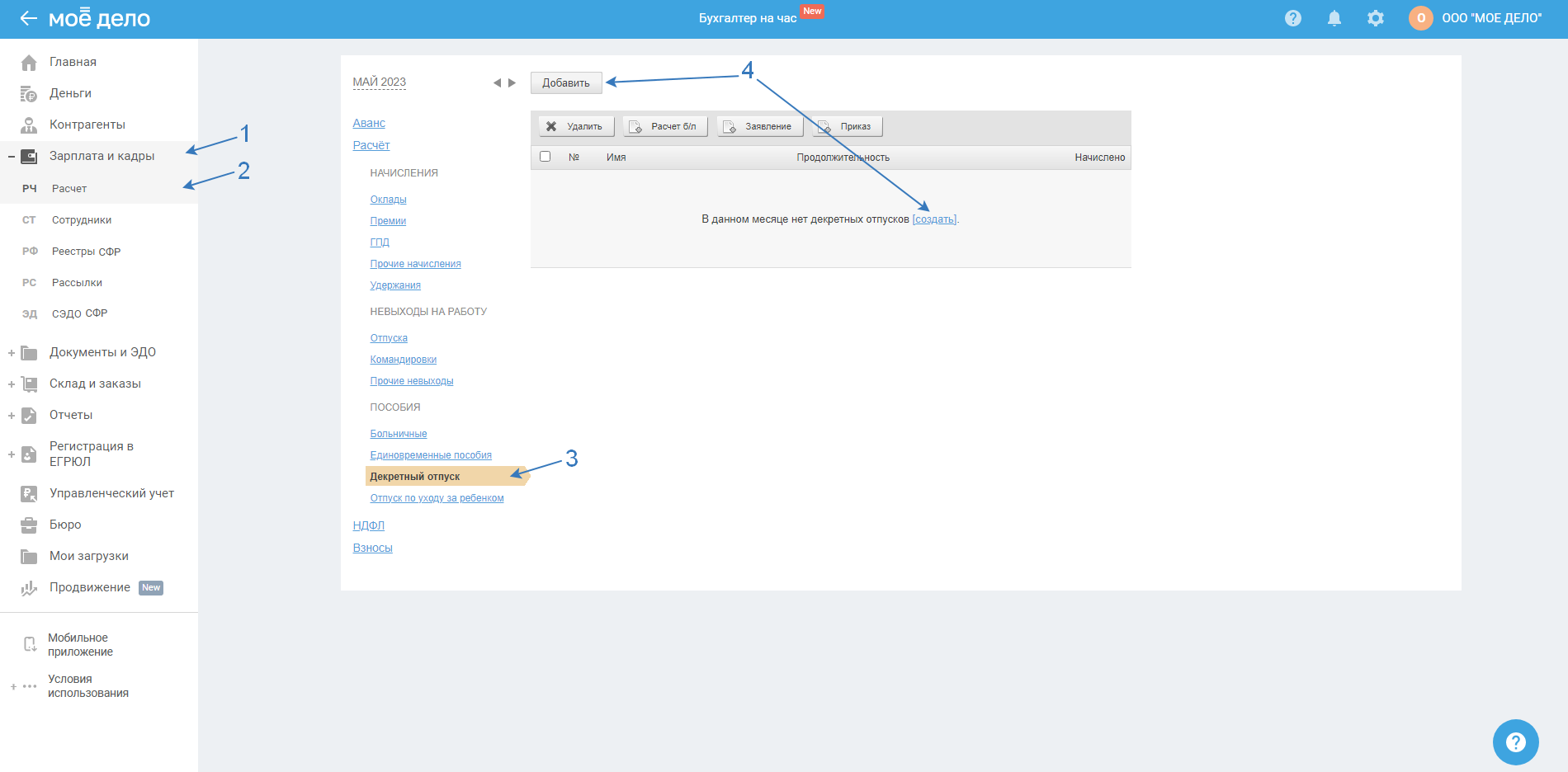 Пройдите в раздел «Зарплата и кадры — Расчёт», выберите в вертикальном меню «Декретный отпуск», нажмите «Добавить / создать»: