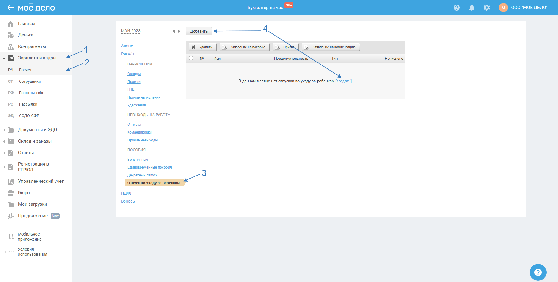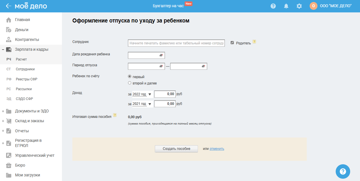 Пройдите в раздел «Зарплата и кадры — Расчёт», выберите в вертикальном меню «Отпуск по уходу за ребёнком», нажмите «Добавить/создать»: