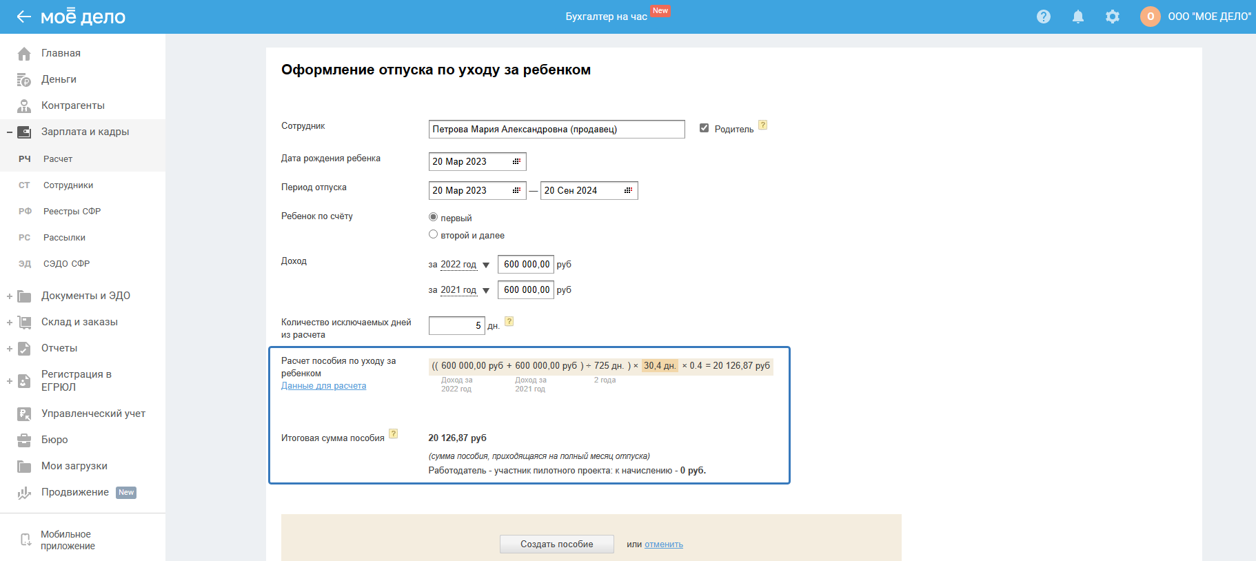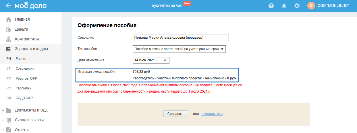 После указания данных сервис рассчитает сумму пособия: