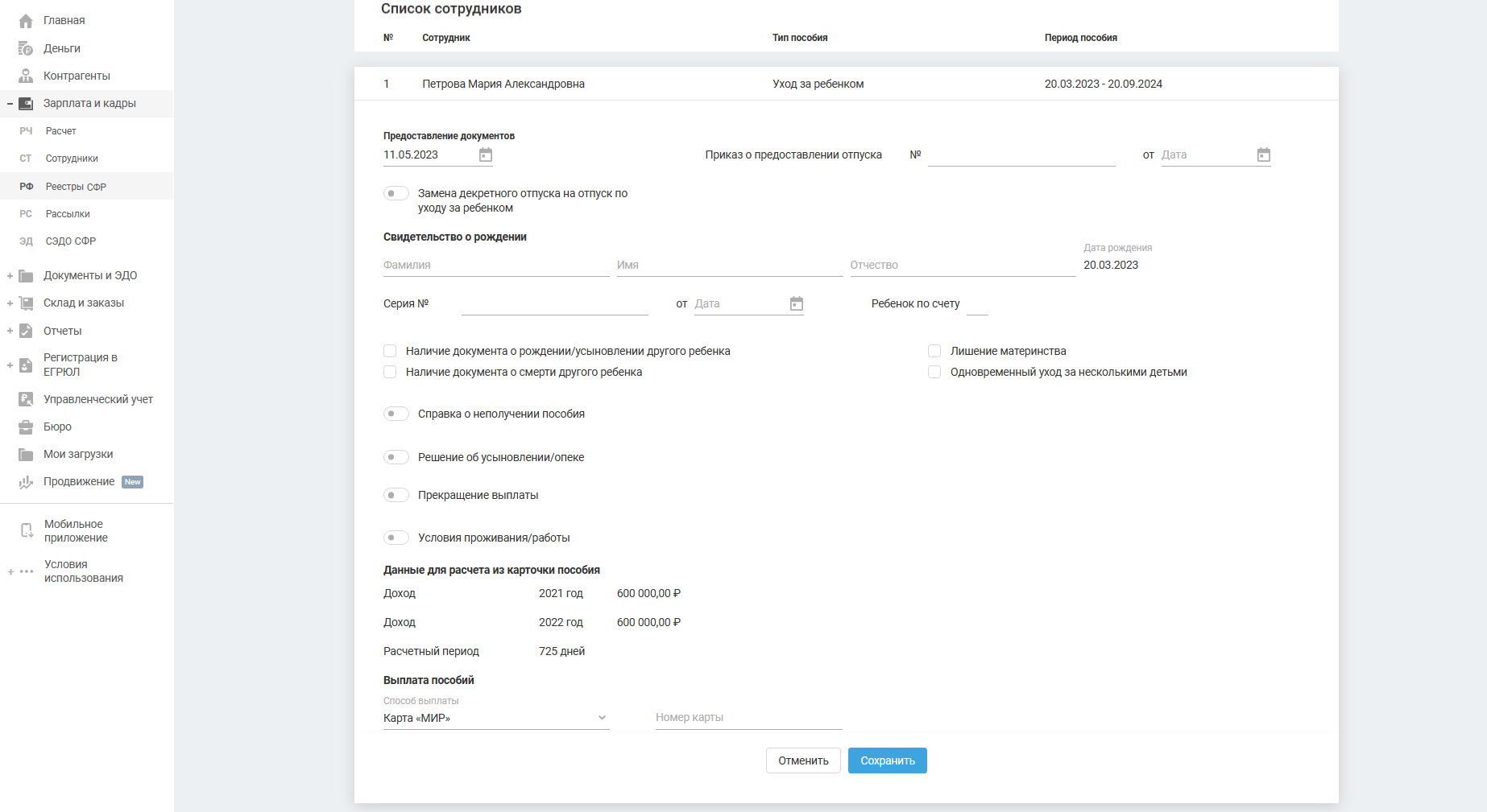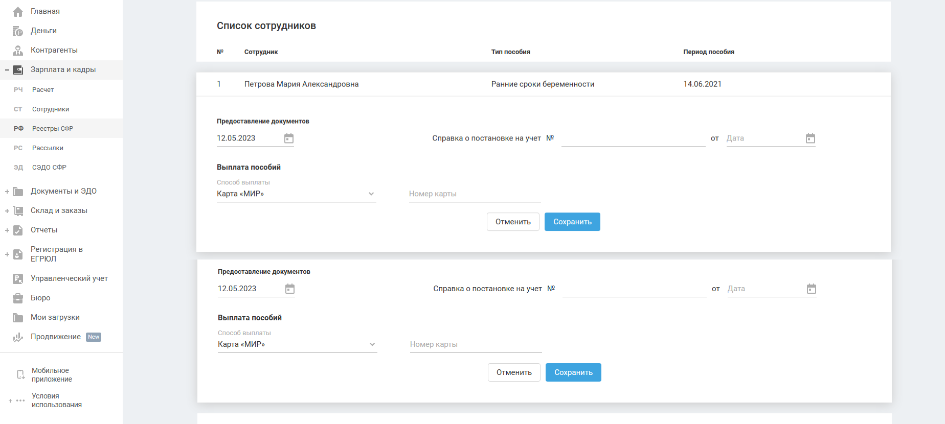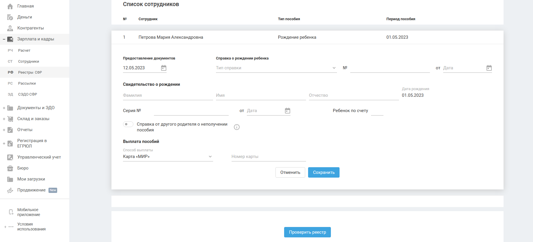 Далее перейдите в «Зарплата и кадры — Реестры СФР» и по кнопке «+ Реестр» добавьте сотрудника и его пособие.