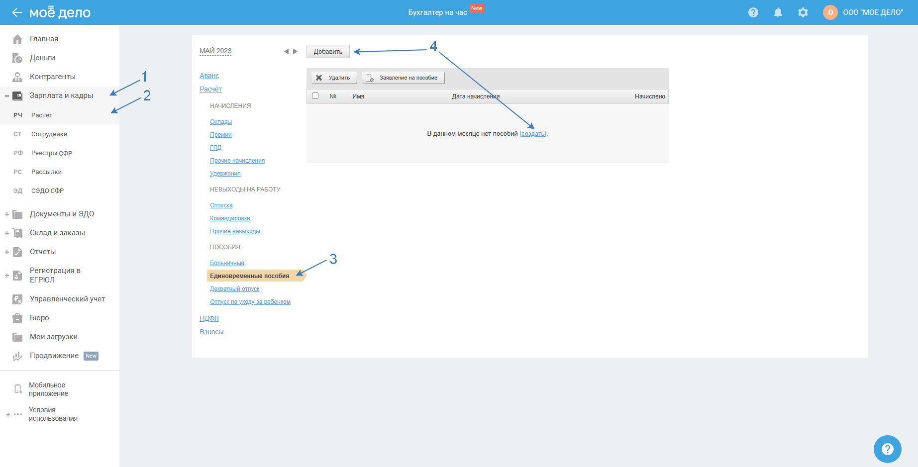 Пройдите в раздел «Зарплата и кадры — Расчёт», выберите в вертикальном меню «Единовременные пособия», нажмите «Добавить / создать»: