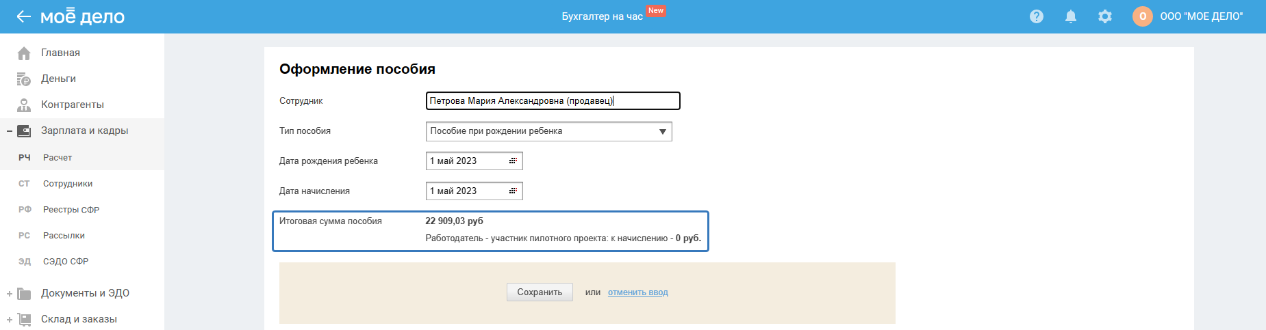 Т.к. работодатель является участником пилотного проекта, то часть денежных средств сотруднику выплачивает работодатель, а часть — СФР перечисляет на счёт сотруднику.