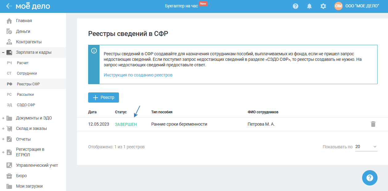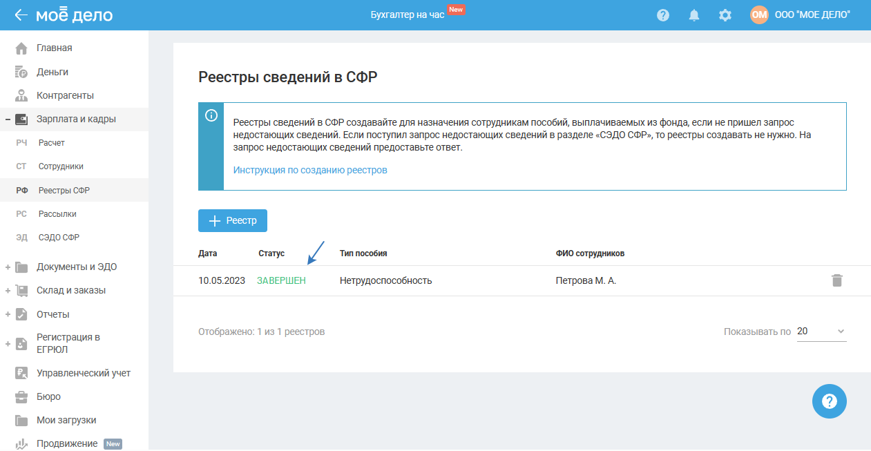 При нажатии на кнопку «Завершить» открывается страница «Реестры сведений в СФР». Статус реестра отображается «Завершён»: