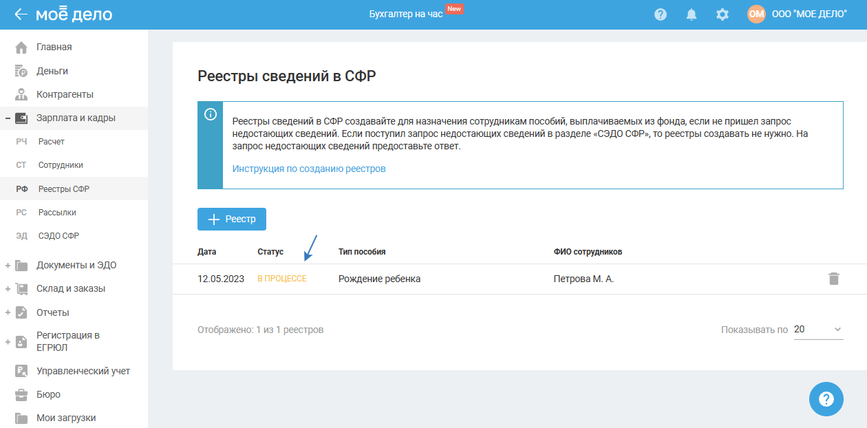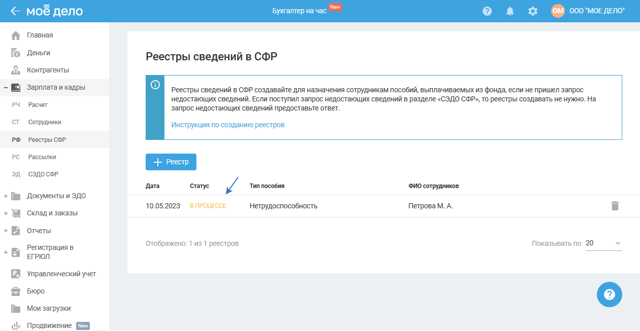 При нажатии на кнопку «Выйти» откроется страница «Реестры сведений в СФР» со статусом реестра «В процессе»: