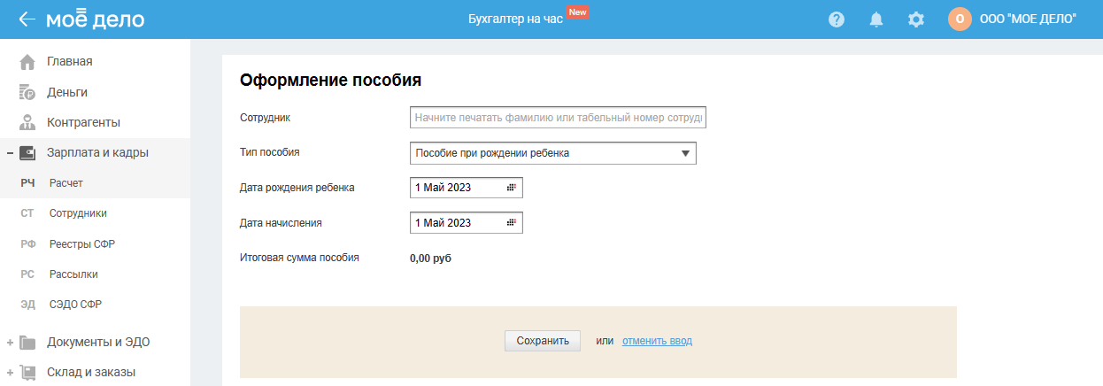 В открывшемся окне заполните данные. Тип пособия — «Пособие при рождении ребенка».