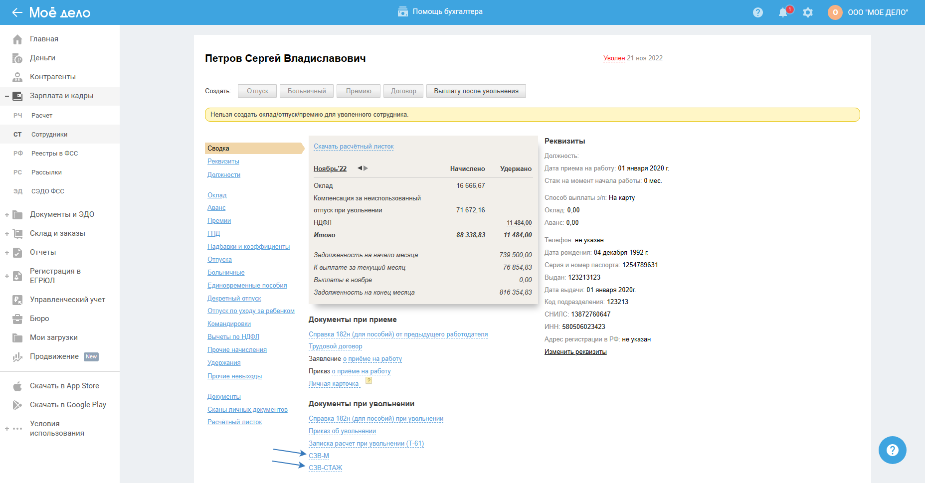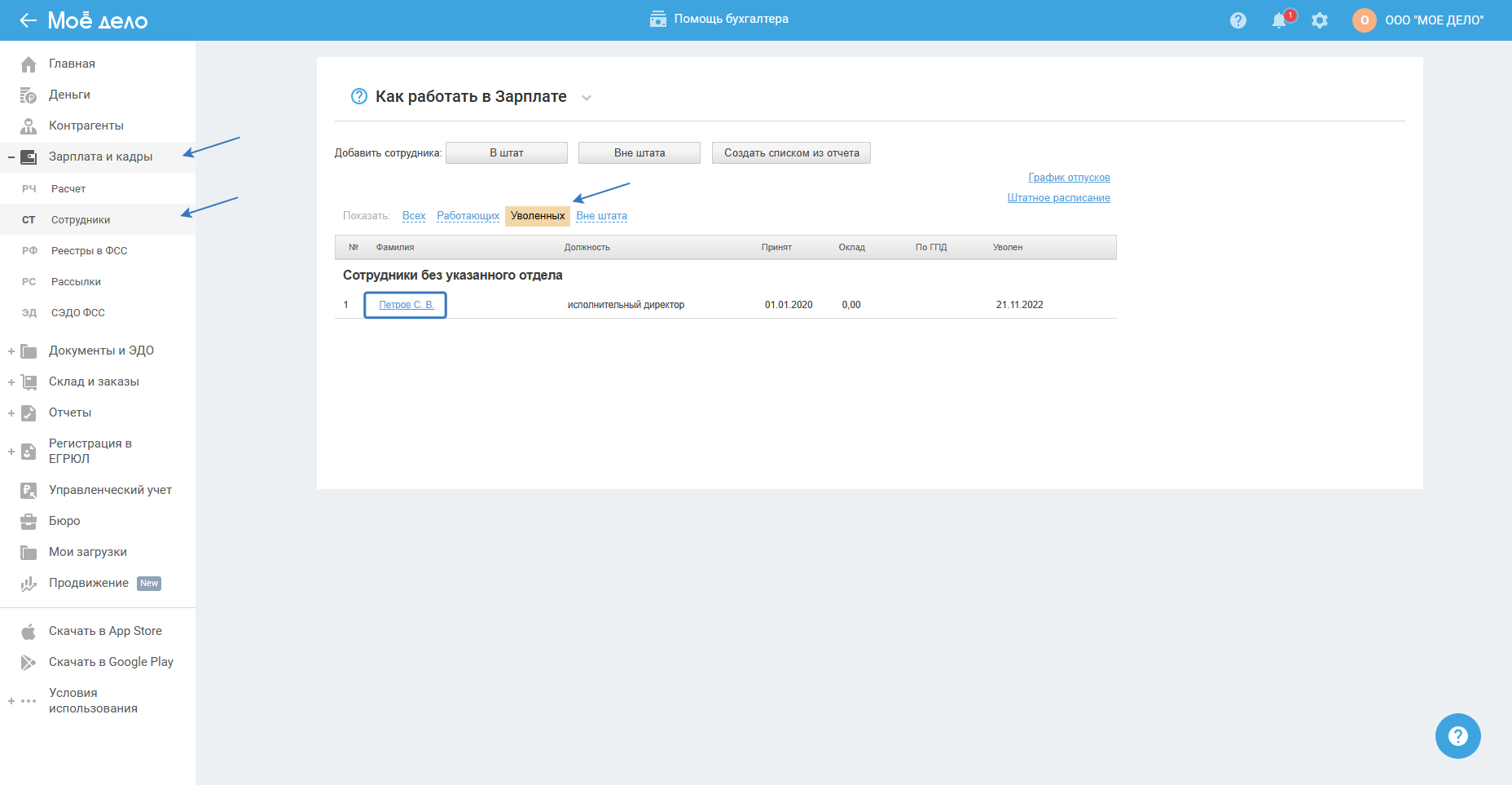 Для того чтобы скачать документы по сотруднику, работавшему по трудовому договору, после его увольнения перейдите в раздел «Зарплата и кадры — Сотрудники» во вкладку «Уволенные» (см. как уволить сотрудника) и нажмите на фамилию сотрудника: