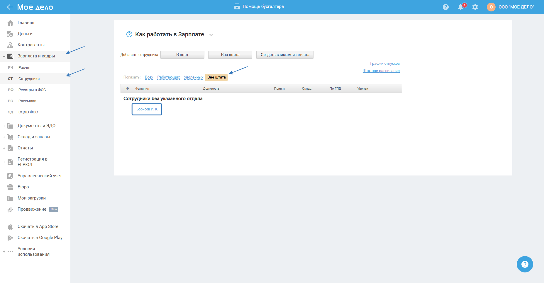 Для того чтобы скачать документы по сотруднику, работавшему по договору гражданско-правового характера, перейдите в раздел «Зарплата и кадры — Сотрудники» во вкладке «Вне штата» нажмите на фамилию сотрудника: