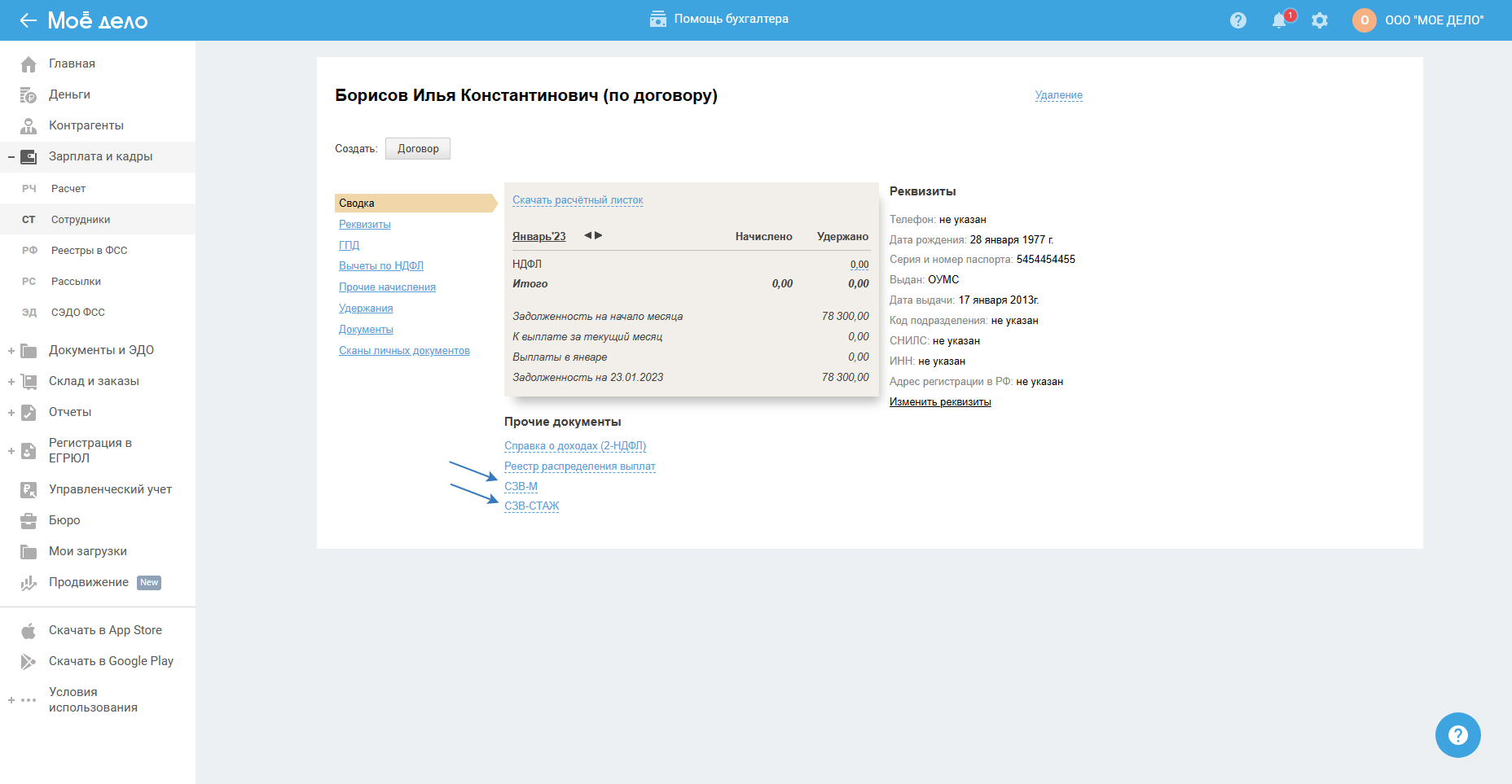 В блоке «Прочие документы» нажмите на ссылку интересующей формы «СЗВ-М» или «СЗВ-СТАЖ». Документы будут доступны при условии, что нет действующего договора.