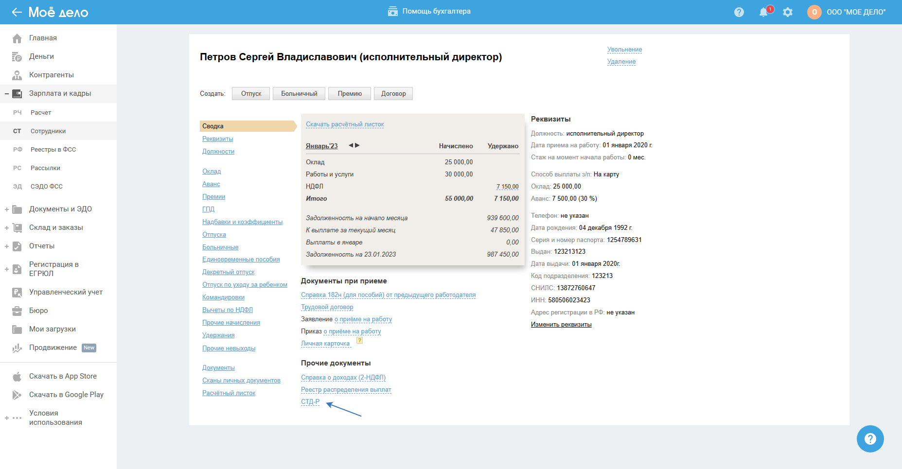 Для сотрудника в штате доступно скачивание формы СТД-Р (Сведения о трудовой деятельности выдаются при увольнении или по запросу сотрудника с электронной трудовой книжкой). При нажатии на ссылку «СТД-Р» в блоке «Прочие документы», скачивается заполненный бланк в формате word с данными о трудовой деятельности по сотруднику: