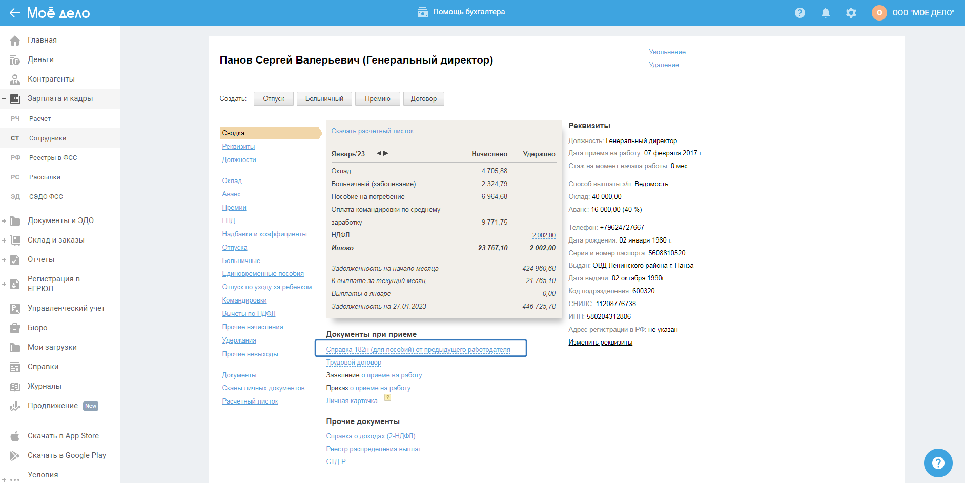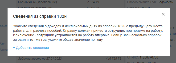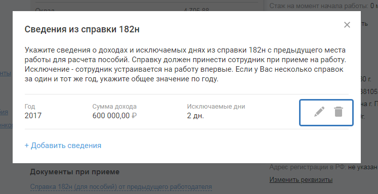 Для того чтобы занести сведения из справки, в личных данных сотрудника в разделе «Документы — Документы при приёме» выберите «Справка 182н (для пособий) от предыдущего работодателя»: