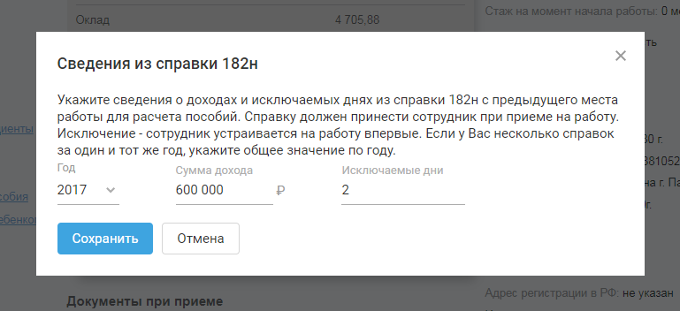 Из выпадающего списка выберите год, укажите сумму доходов из справки 182н и исключаемые дни, затем нажмите на кнопку «Сохранить»: