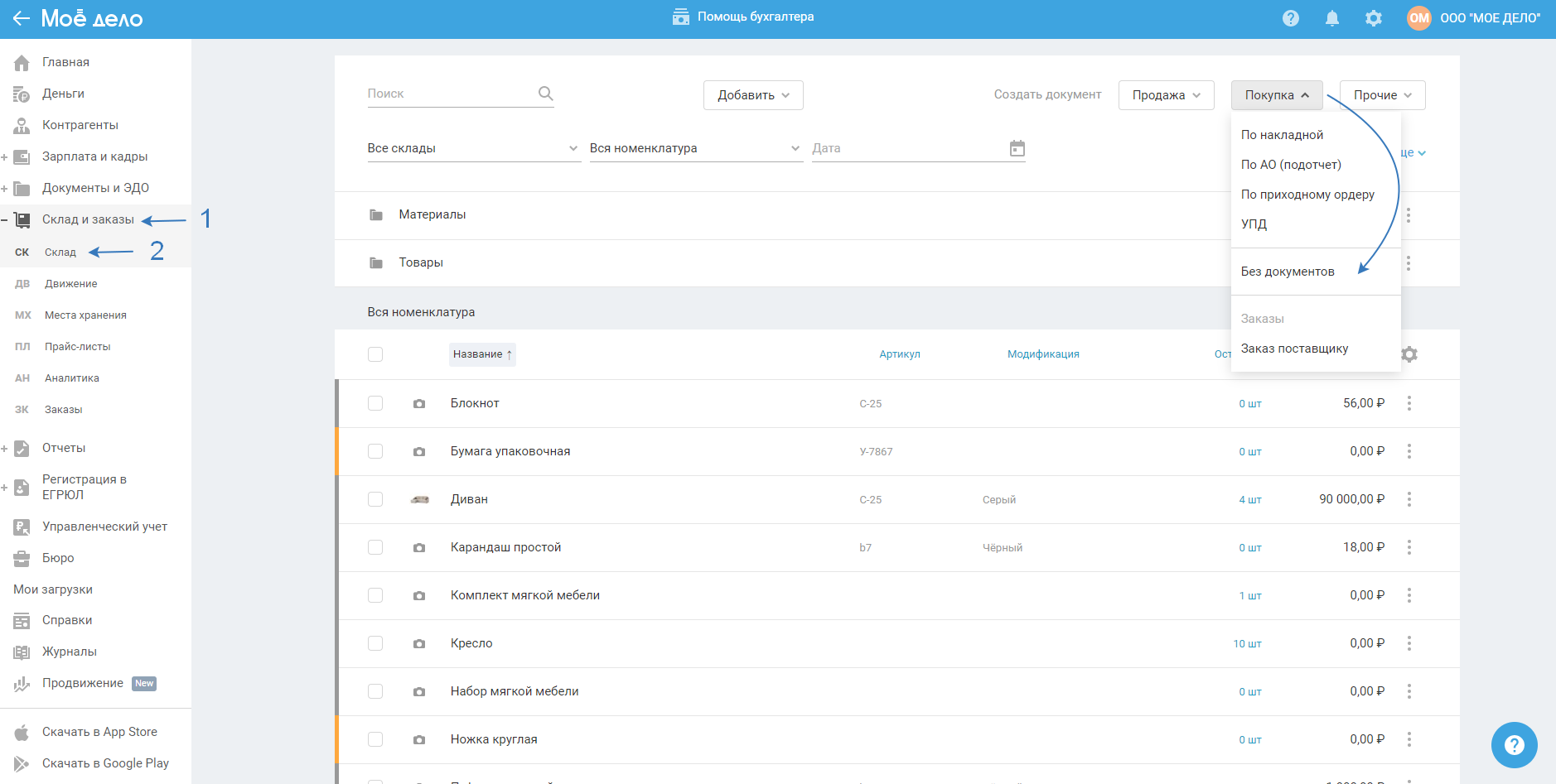 1. В меню выберите раздел «Склад и заказы — Склад», нажмите на кнопку «Покупка» и выберите «Без документов»: