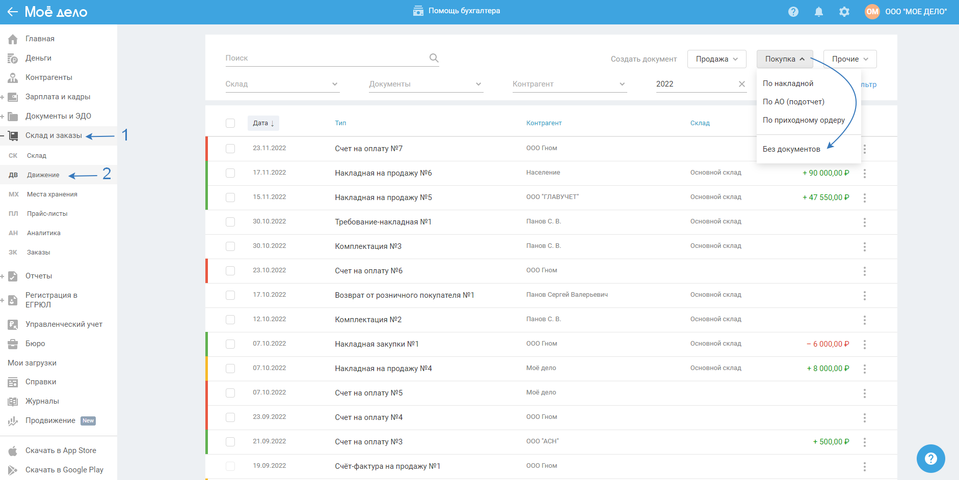 2. В меню выберите раздел «Склад и заказы — Движение», нажмите на кнопку «Закупка» и выберите «Без документов»: