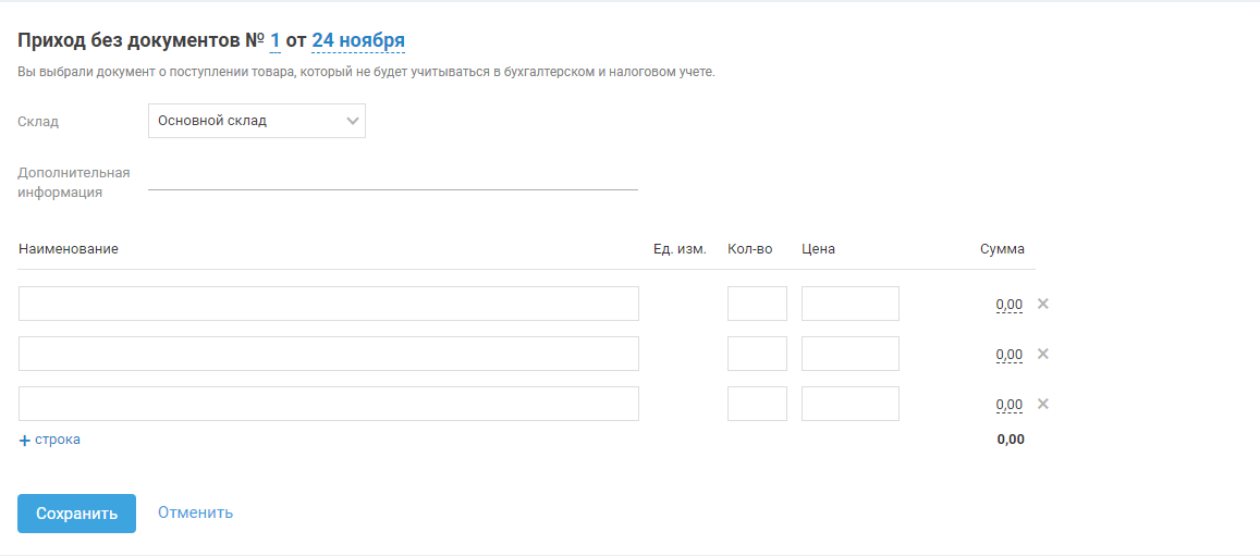 Если у вас возникла необходимость оприходовать на склад товары, по которым нет документов или документы есть, но вы не хотите их учитывать в бухгалтерском и налоговом учёте, воспользуйтесь функцией «Приход без документов».