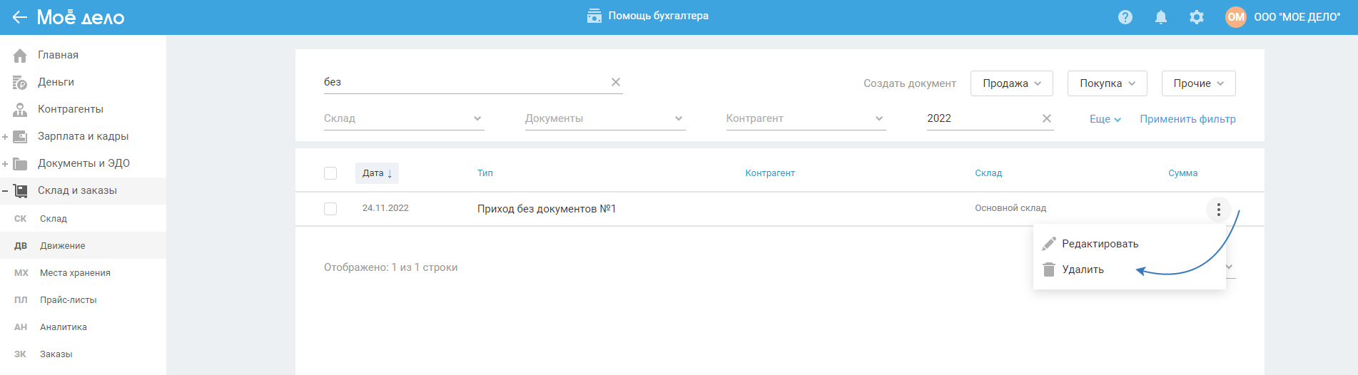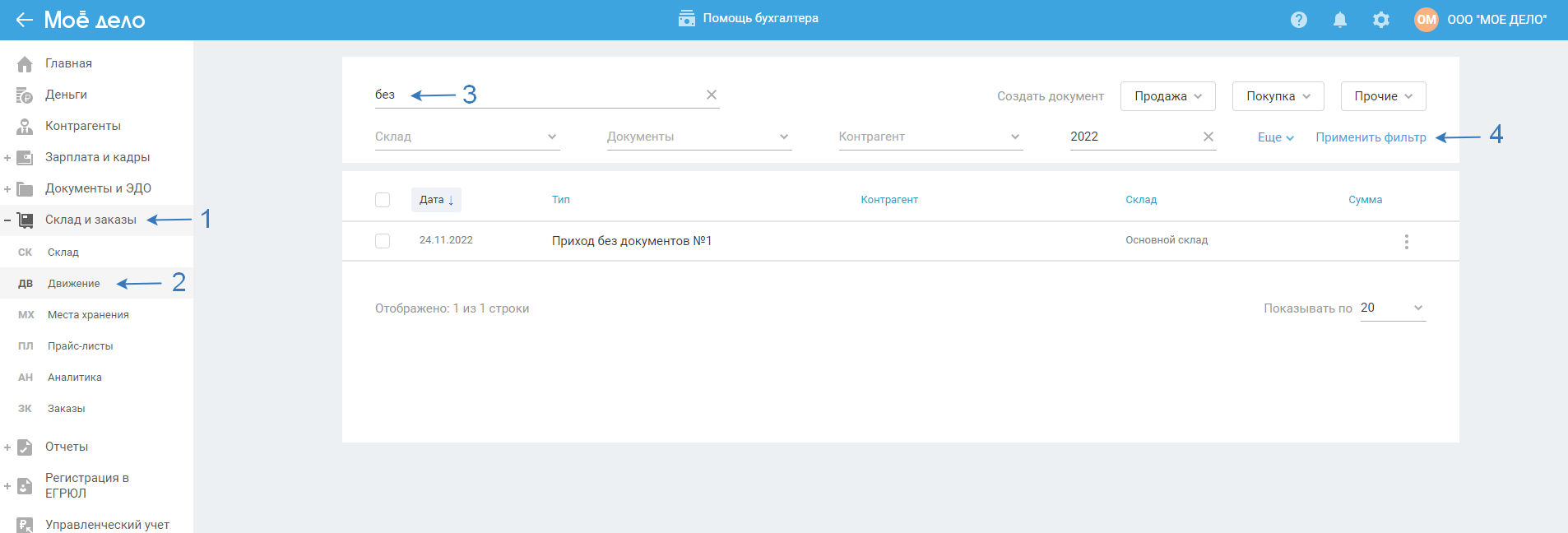 После того, как «Приход без документов» будет сохранен, найти его можно будет в разделе «Склад и заказы — Движение». Введите в поисковой строке название документа полностью или частично и нажмите кнопку «Применить фильтр». В таблице появится список документов, при необходимости, отредактируйте документы, нажав на название документа откроется форма для его редактирования.