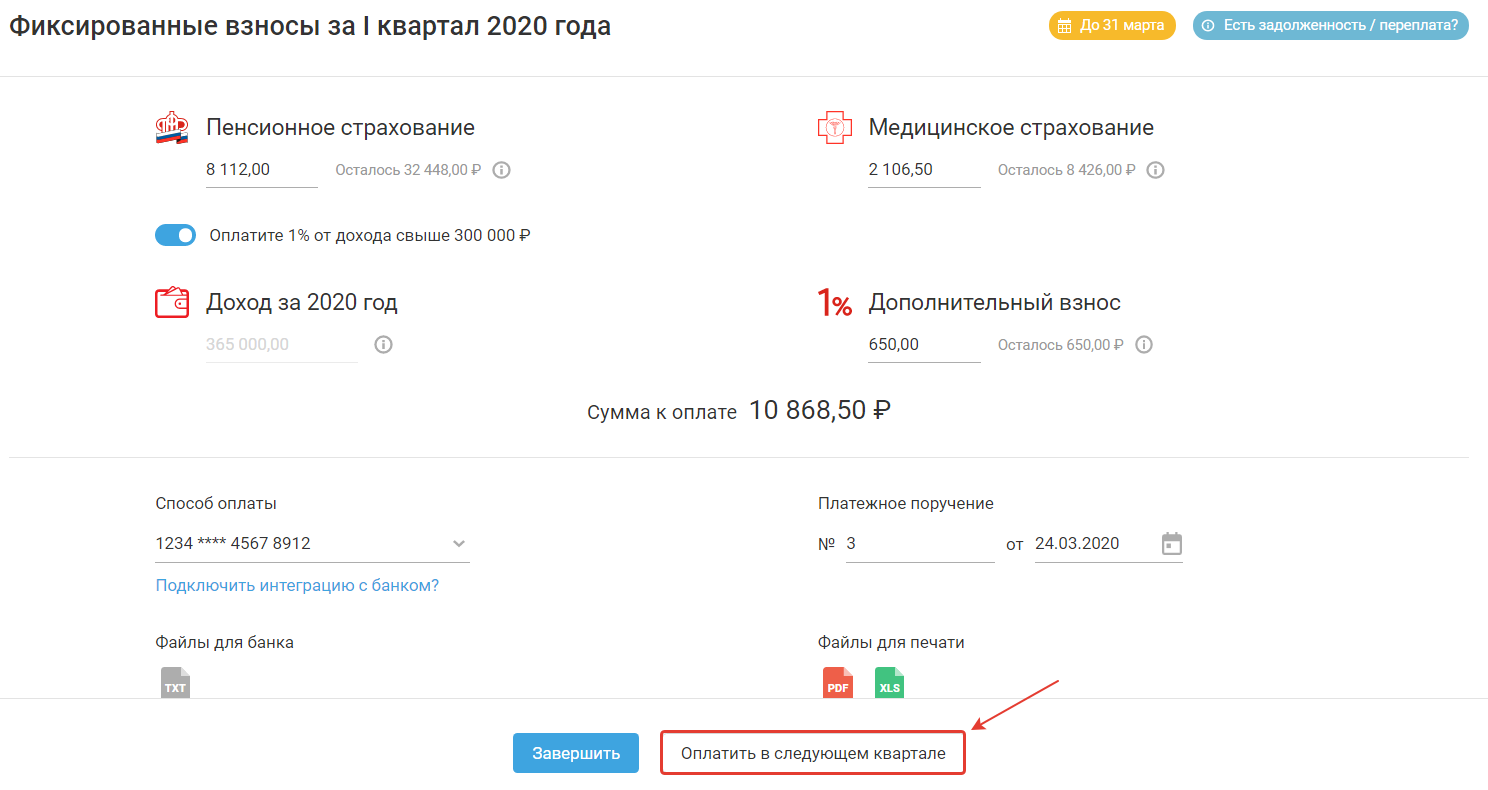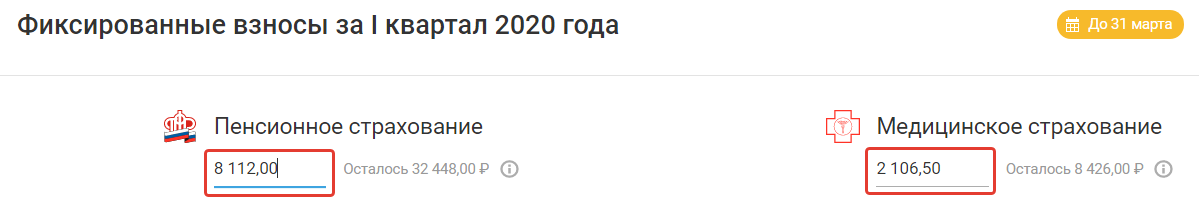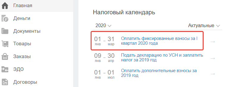 В «Налоговом календаре» нажмите на действие «Оплатить фиксированные взносы за _ квартал 20_ года» или «Оплатить фиксированные взносы за 20_ год». Они станут активными в начале соответствующего квартала.
