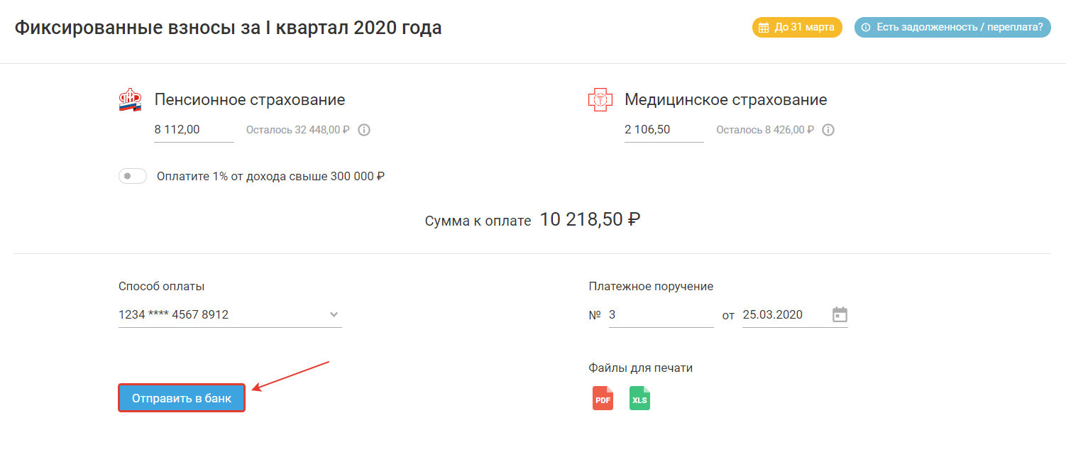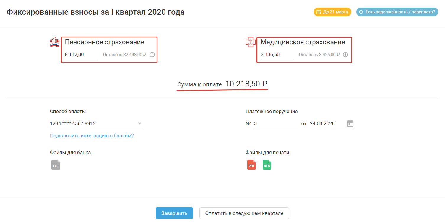 В открывшемся окне уже имеются готовые суммы взносов и платежные документы.
