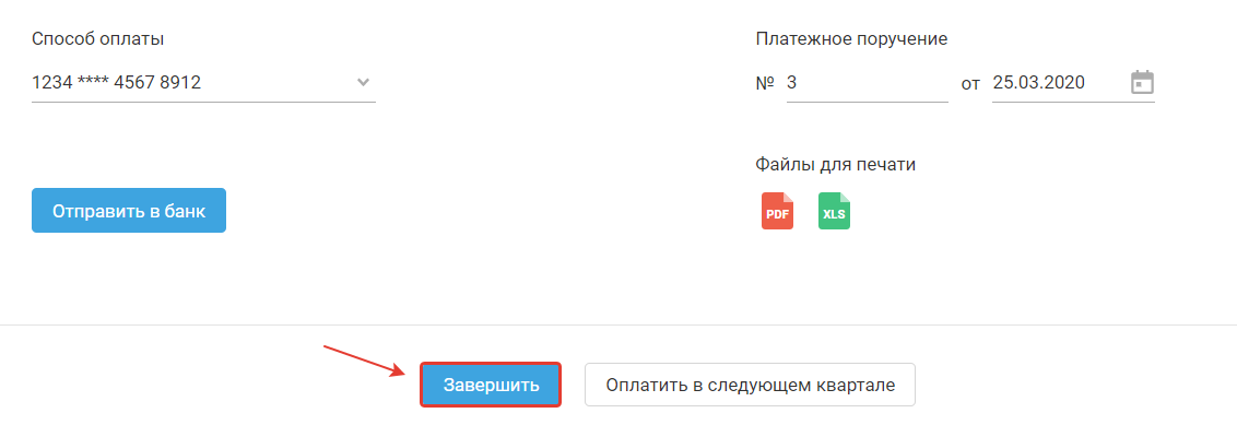 Далее после проведения оплаты одним из способов нажмите "Завершить".