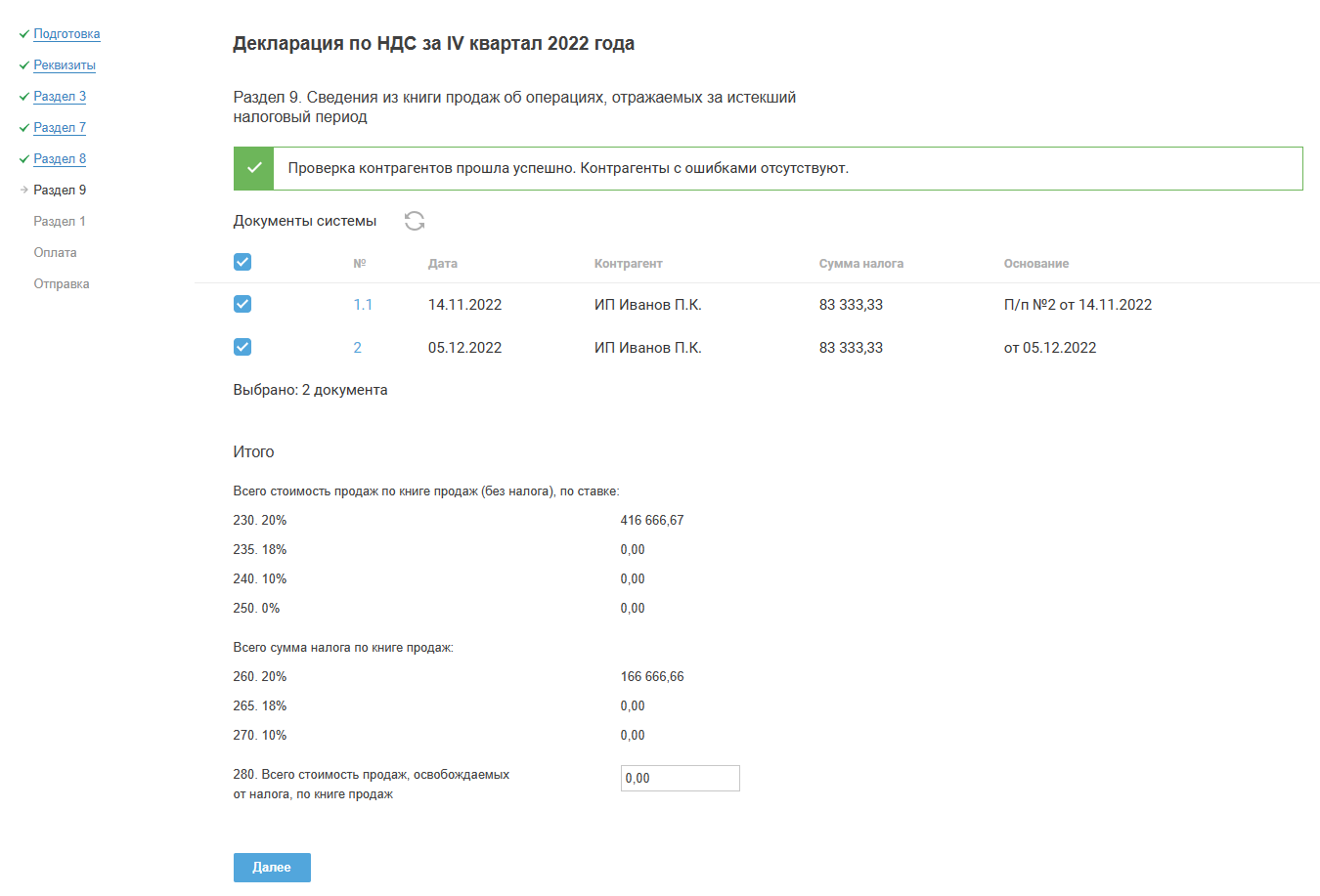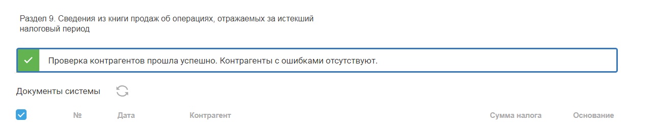 В разделе 9 осуществляется проверка контрагентов. Если проверка прошла успешно, то будет выведено сообщение «Проверка контрагентов прошла успешно. Контрагенты с ошибками отсутствуют»: