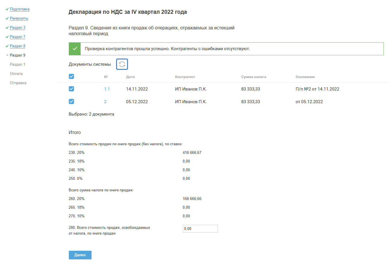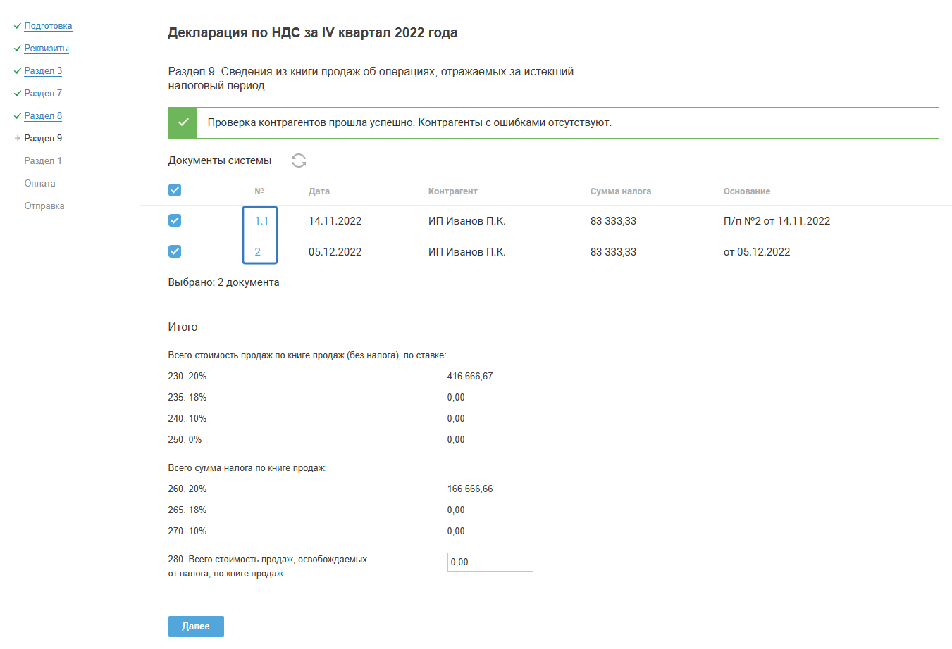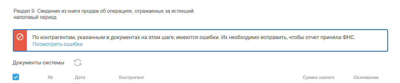 Если по контрагентам, указанным в документах на этом шаге, имеются ошибки, то будет выведено сообщение «По контрагентам, указанным в документах на этом шаге, имеются ошибки. Их необходимо исправить, чтобы отчёт приняла ФНС»: